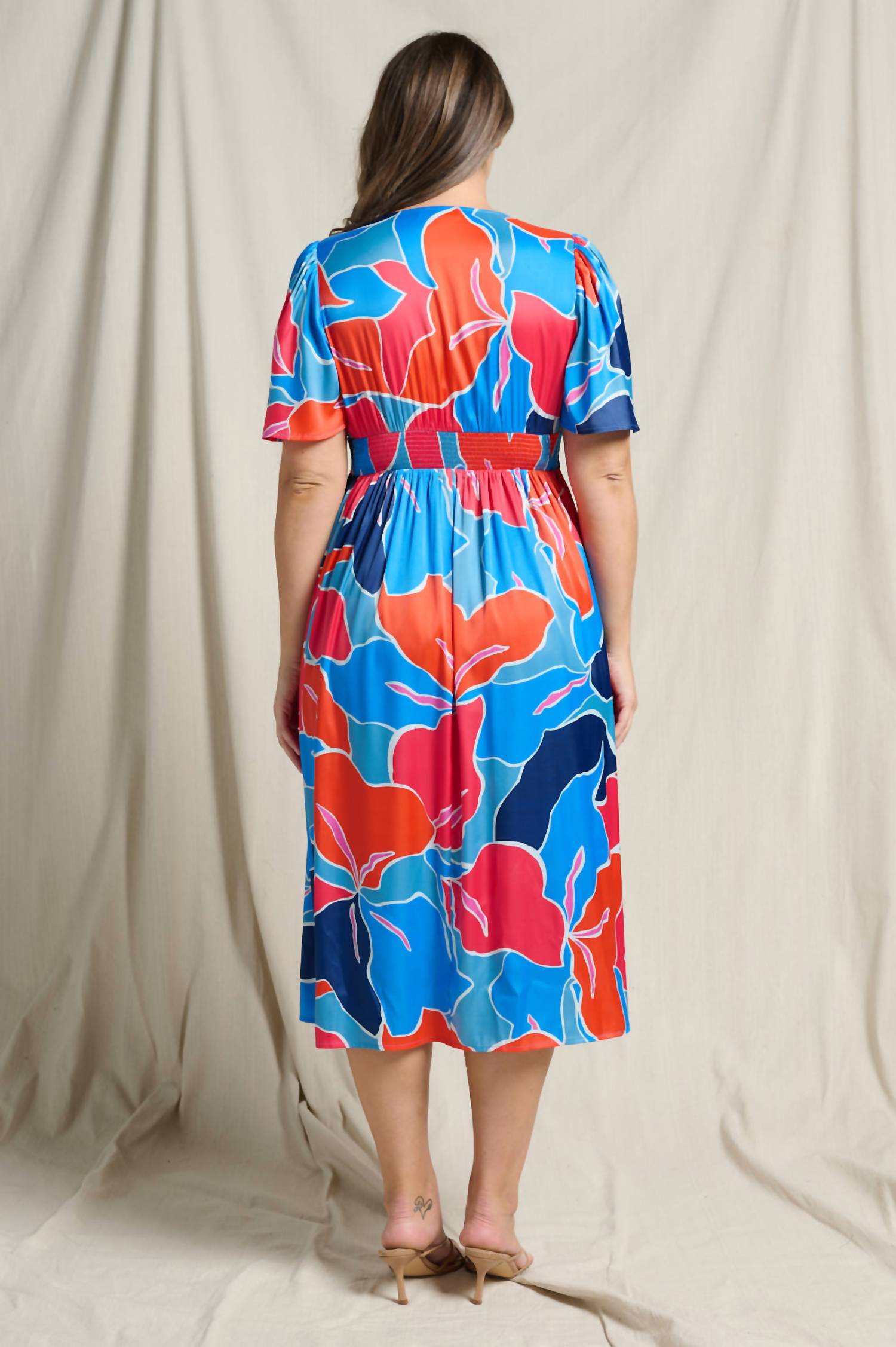 Unveil your vibrant summer style with the Doe and Rae Floral V-neck Flutter Short Sleeve Dress, an ideal piece for vacation delight. Crafted with short flutter sleeves and a smocked waist, the A-line silhouette showcases a bold cobalt and orange floral pattern. This midi-length dress is made from 100% Polyester and features side pockets for added convenience. Closure: Pull-on. Care: Hand wash and line dry.