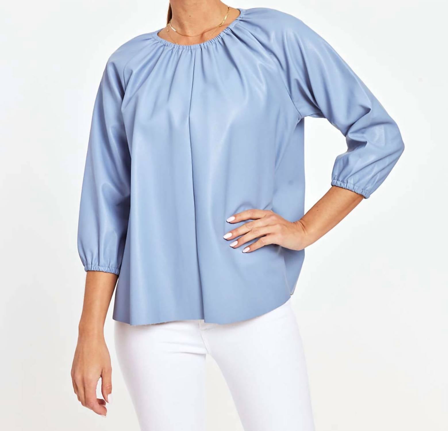 Dolce Cabo vegan leather three-quarter sleeve top with gathered neckline. Soft material for ease and comfort. Suitable for any weather. Three-quarter exaggerated puff relaxed sleeve. Relaxed fit. Lightweight vegan leather. Wipe with a damp cloth. Sizing: true to size; the model is 5'11" and is wearing size S.