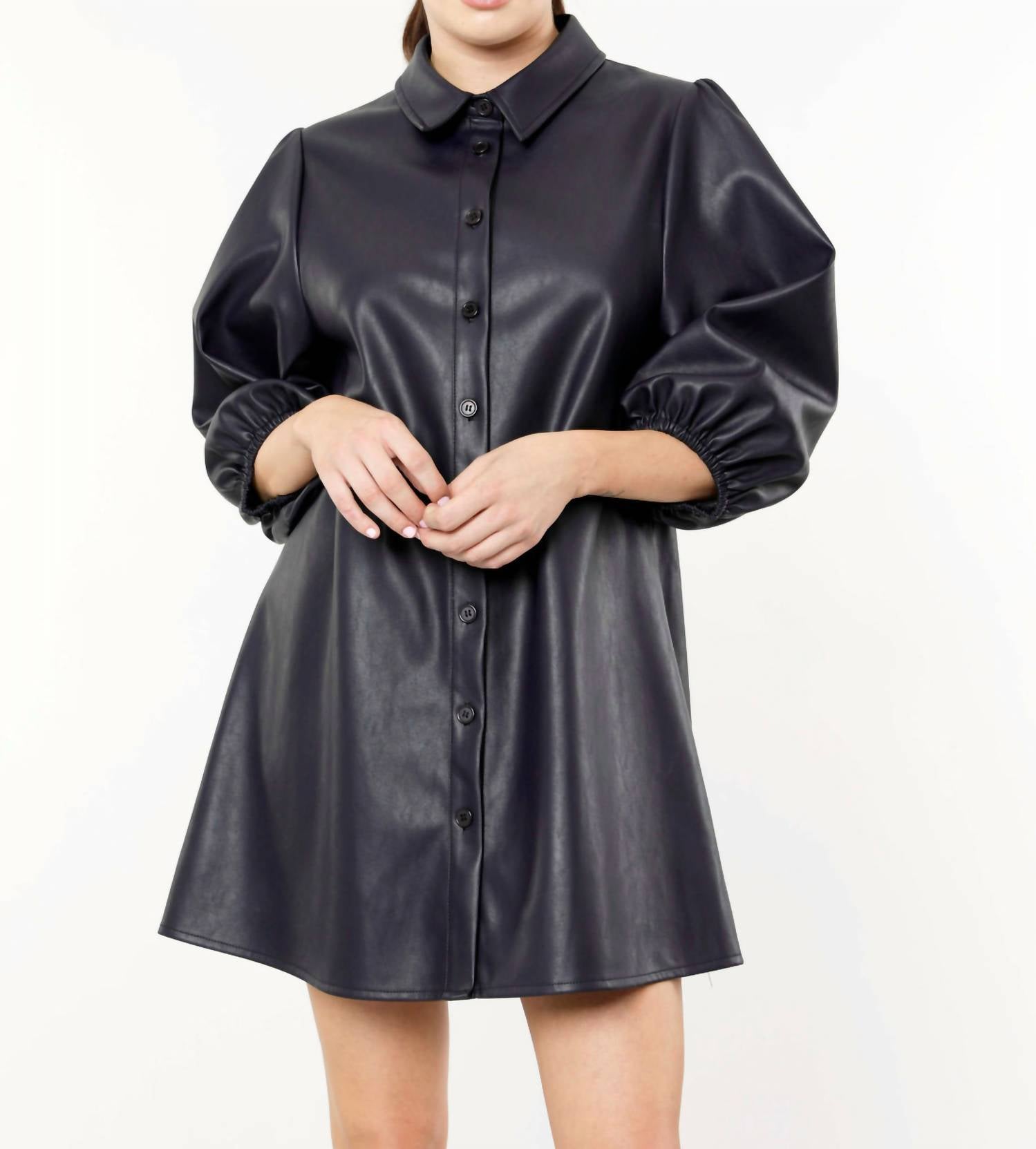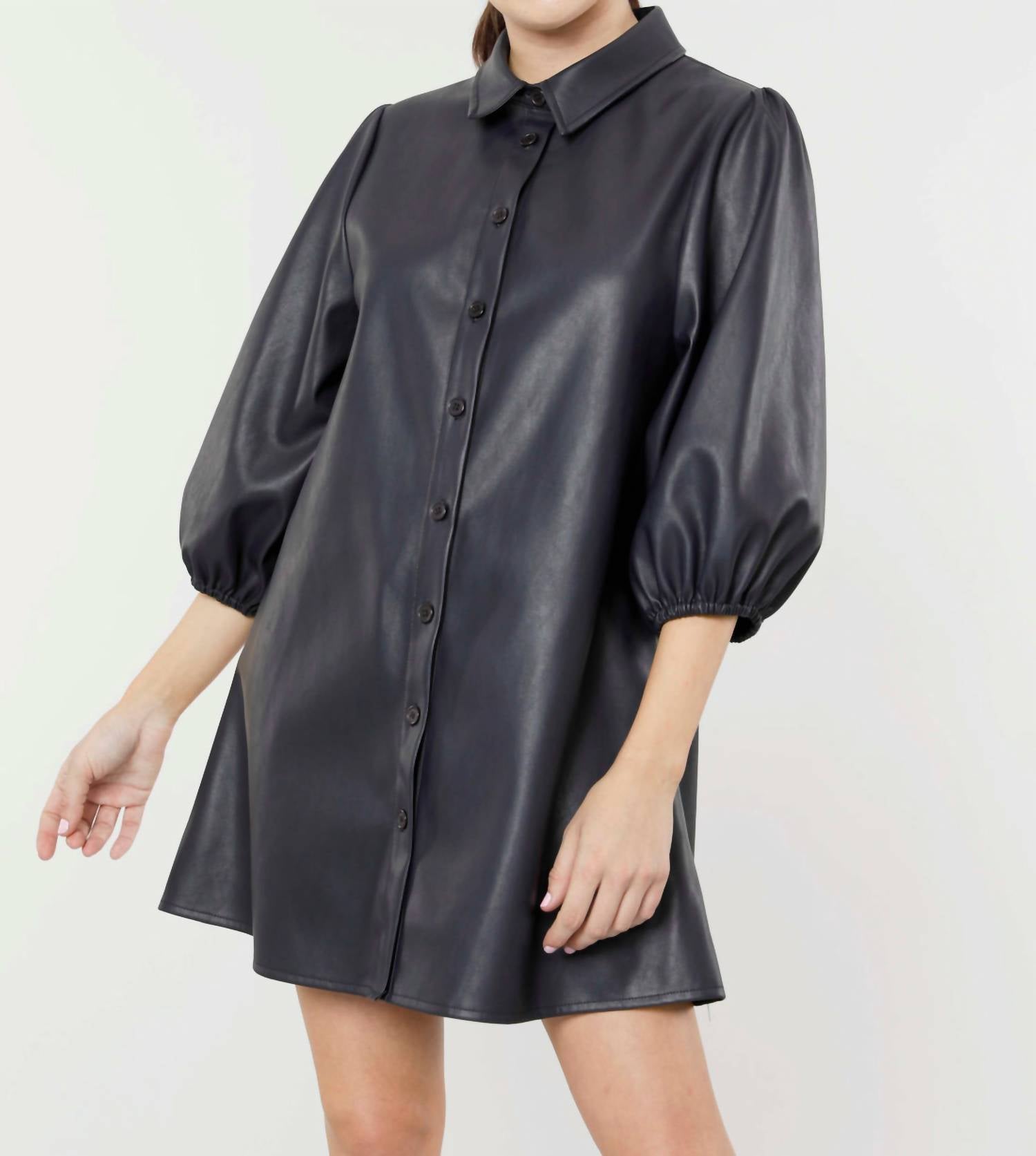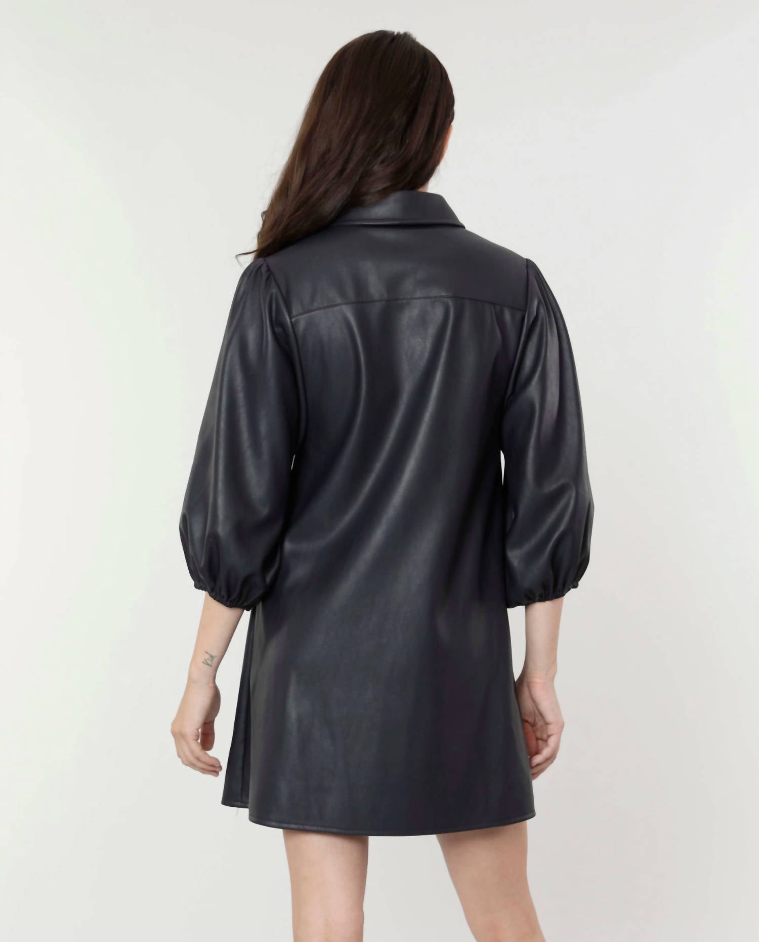 Vestido de couro sintético com mangas bufantes. Couro vegano leve. Mangas bufantes três quartos. Abotoamento frontal com gola clássica. Caimento folgado. Limpar com um pano úmido.