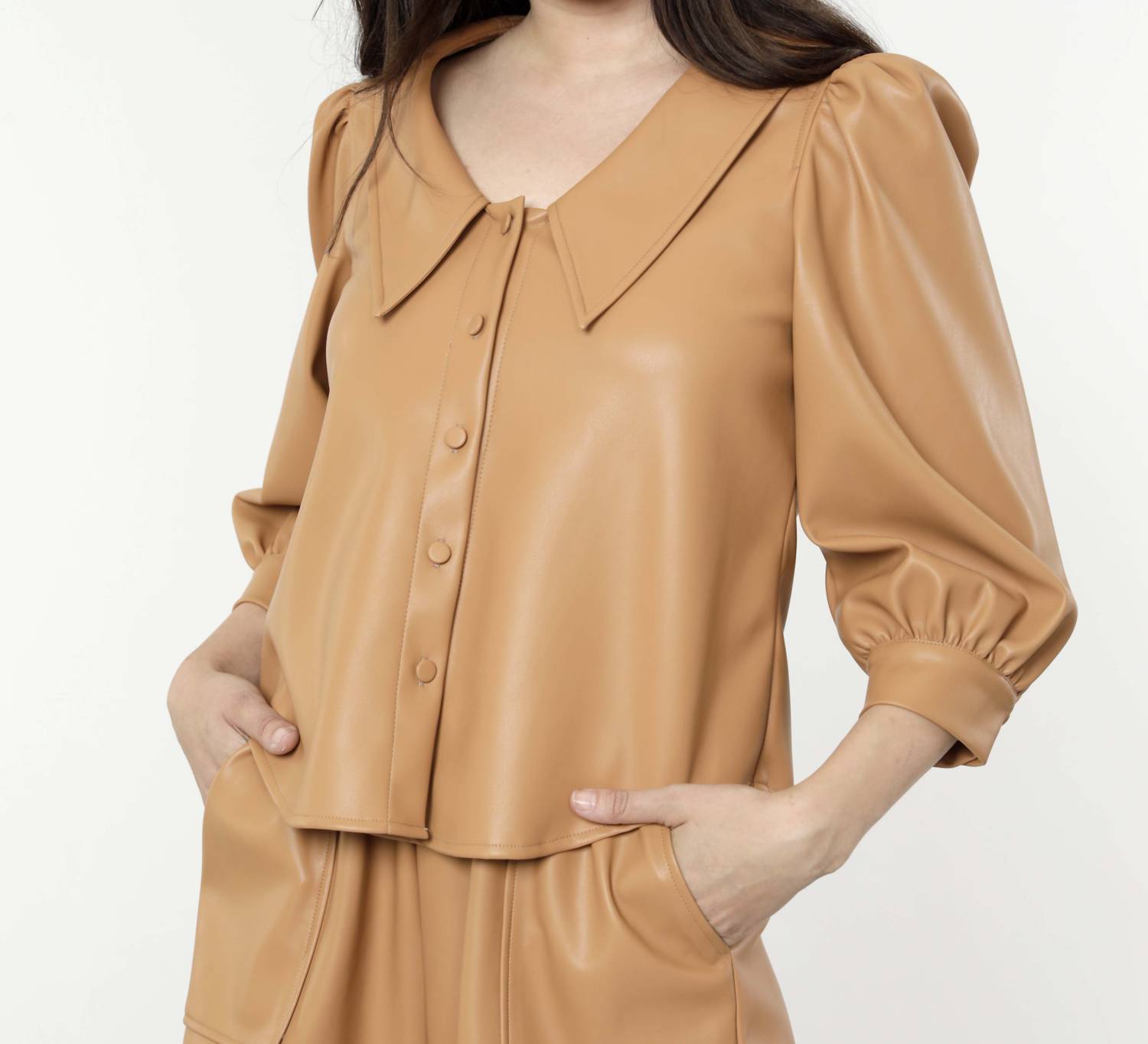 Uma blusa versátil que pode ser usada do escritório ao jantar! Blusa de couro sintético com mangas bufantes. Design chique e preppy. Silhueta romântica. Material de couro vegano. Abotoamento frontal com gola clássica. Mangas três quartos bufantes para um toque boêmio. Cuidados: Lavagem a seco.