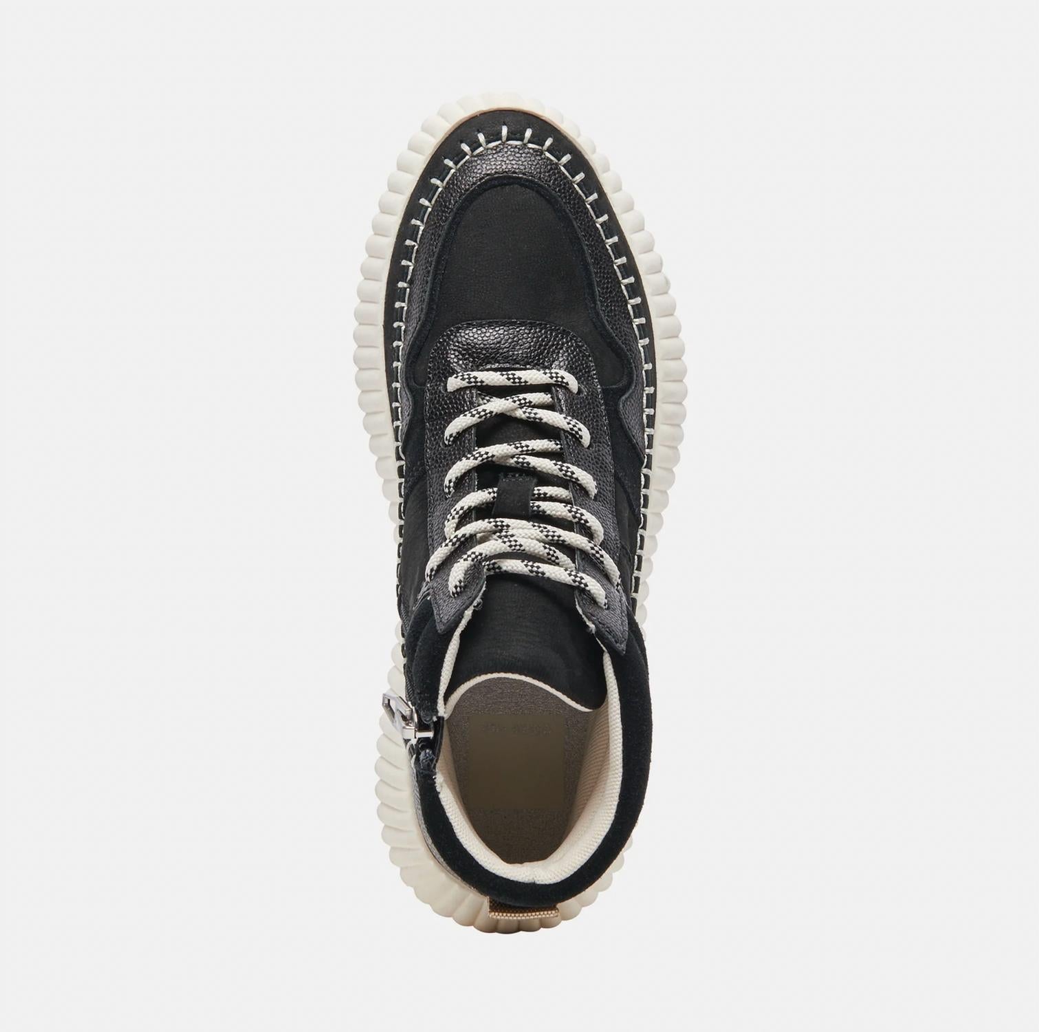 Estes tênis de cano alto apresentam sola de borracha plataforma com cabedal de couro, solado de borracha, forro de mesh e meia sintética. O cano tem 2,5 cm de altura, com circunferência da perna de 25 cm e plataforma de 4,0 cm. Importado.