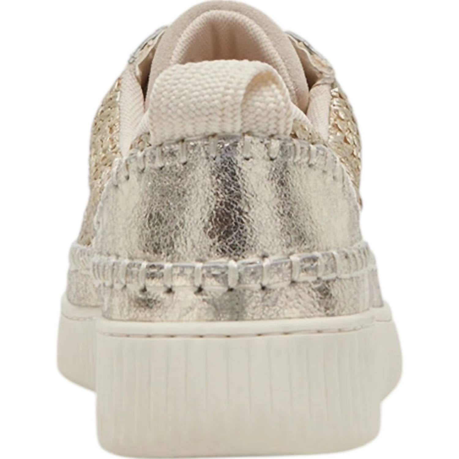 Eleve seu estilo com o Tênis Feminino Nicona da Dolce Vita, criado para quem está sempre em movimento. Confeccionado em couro trançado dourado marcante, este tênis combina conforto com um toque contemporâneo. O salto plataforma oferece uma altura de salto padrão baixa, entre 3,9 cm e 5 cm, perfeita para uso diário. Com largura média e bico arredondado, este tênis garante estilo e conforto a cada passo.
