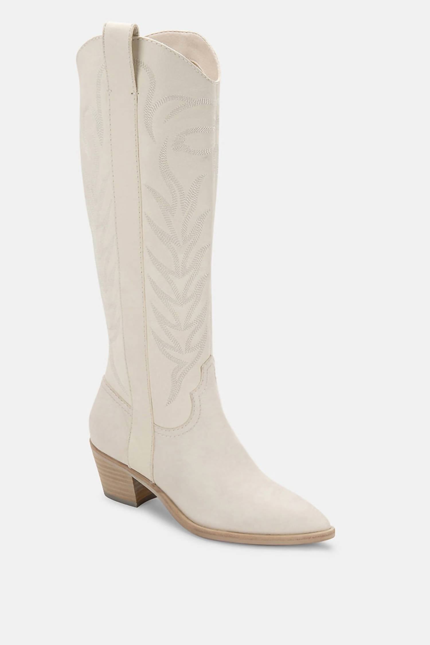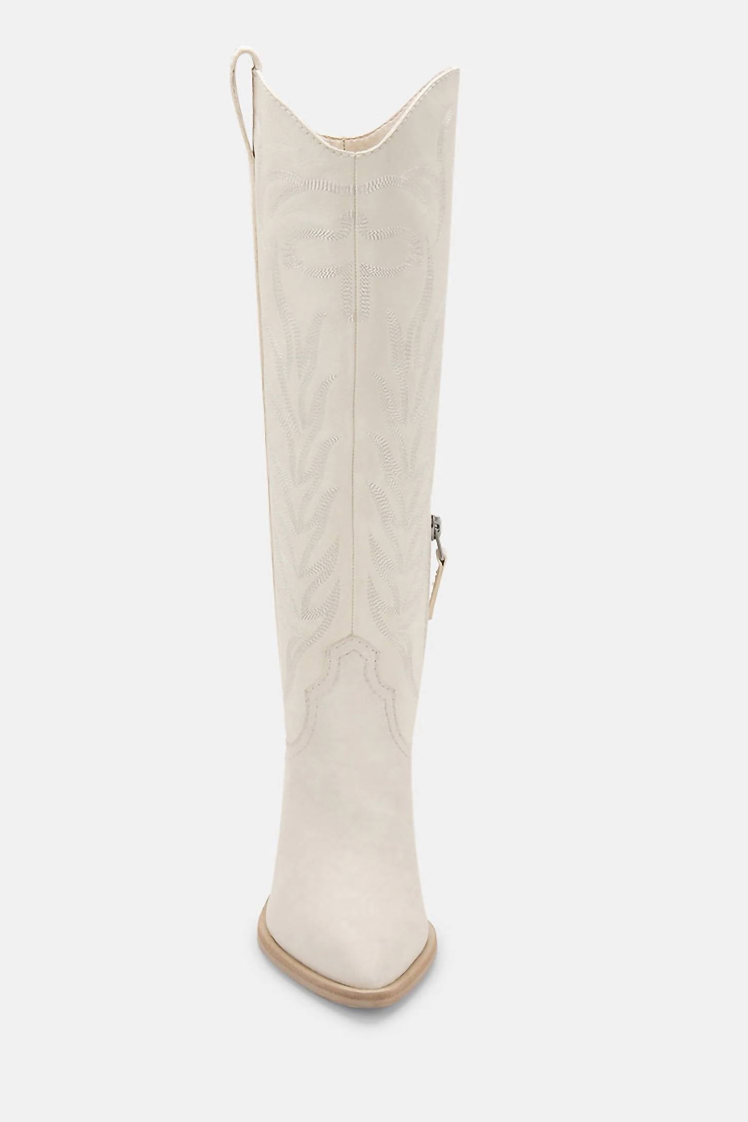 Uma peça marcante com inspiração western em um branco marcante. Confeccionadas em 100% couro, estas botas over-the-knee apresentam bico fino sofisticado e salto bloco confortável com 5 cm de altura. O cano mede 37 cm, enquanto a circunferência da perna é de 40 cm, garantindo um ajuste perfeito para quem busca estilo e praticidade ao mesmo tempo.