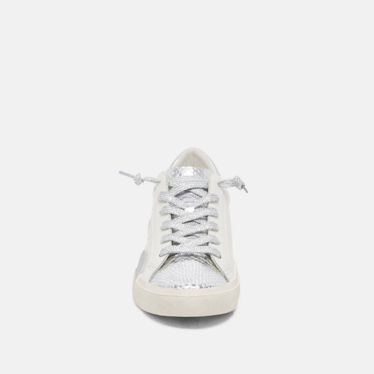 Elevate your casual ensemble with the Women's Zina Sneakers by Dolce Vita, now available in trendy White/Silver Leather. Featuring a chic leather upper paired with a durable rubber outsole and a comfortable textile lining, these sneakers are an essential for summer streetwear. The synthetic sock and round toe shape ensure comfort and style for any occasion, from a casual day out to back-to-school events. Imported with modern design elements, these sneakers effortlessly blend edgy animal prints and cool embossed leathers with bold metallic accents.