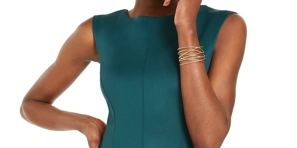 Aproximadamente 94 cm de comprimento, do centro do pescoço até a bainha. O comprimento é baseado no tamanho 6 e varia 6 mm entre os tamanhos. | Decote canoa; modelagem ajustada e ampla | Fecho de zíper nas costas | Crepe scuba completo; acabamento na bainha | Exterior: poliéster/elastano; forro: poliéster