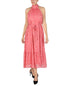 Florais tonais e brilhos metálicos realçam o formato fluido deste vestido midi frente única Donna Ricco que flutua facilmente do escritório ao jantar. | Cinto fino na cintura; babado na bainha | Decote alto frente única com franzido; Silhueta midi | Amarração no decote nas costas | Importado | Forrado | Chiffon; Suave