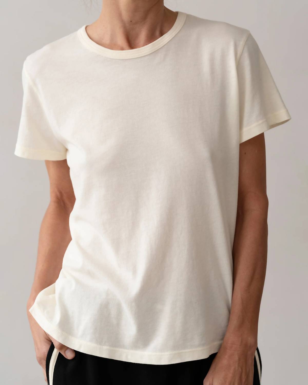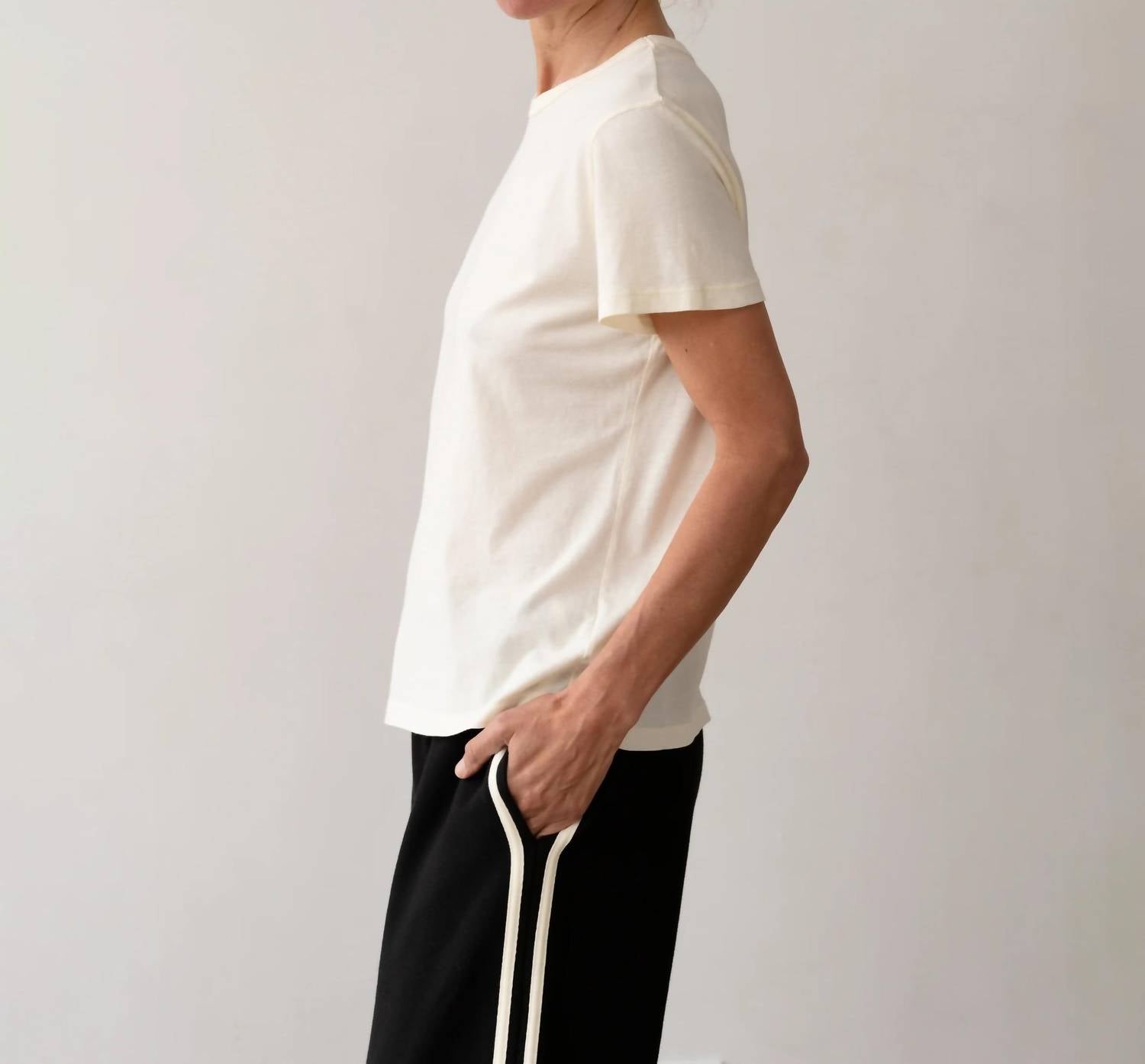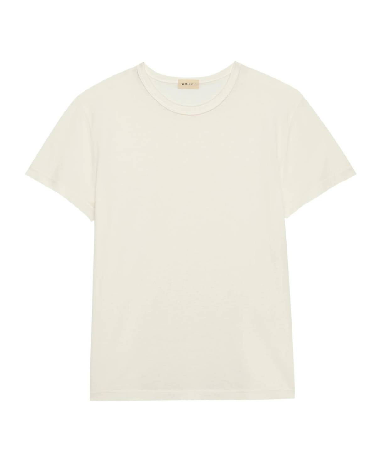 Discover the Jersey Tee by DONNI., the perfect t-shirt for any occasion with its effortlessly wearable design. This short sleeve tee features a classic crewneck and a relaxed fit, making it a seasonless wardrobe essential. Crafted from 100% Supima Cotton and made in Los Angeles, this tee offers unmatched softness and durability. Closure: Pull on. Care: Machine wash cold with like colors and tumble dry low. Available in a chic creme hue, it's the ideal piece for minimalist style and travel.