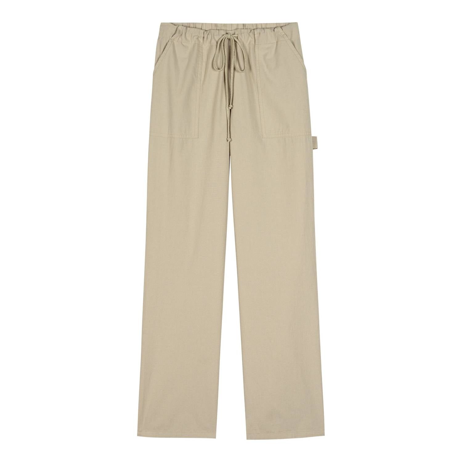 The perfect pant for running around town and looking cool while doing it. Crafted for minimalist style in shitake beige. Full-length, mid-rise pants feature a regular fit with a straight leg, drawcord waistband, and practical side and back pockets with a hammer loop. Made from lightweight 100% cotton. Perfect for vacation wear and easy care: machine wash cold on a delicate cycle and tumble dry low. Model Maya (5’9”, 34” bust, 25” waist, 33.5” hips) is wearing a size small.