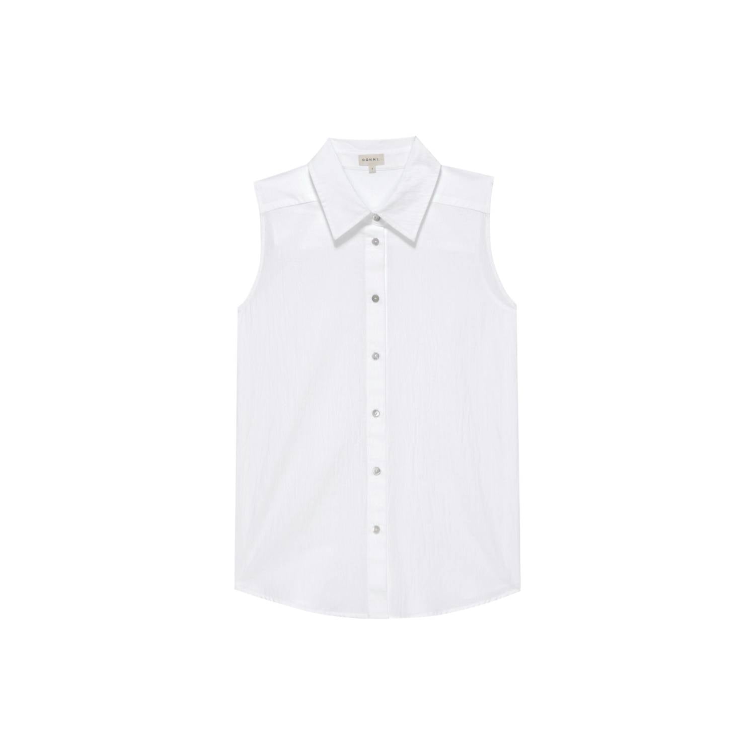A versatile blouse that works from desk to dinner! Introducing the Sandwash Sleeveless Shirt Top by DONNI., a chic piece in a serene powder hue perfect for summer getaways. Crafted from breathable cotton, this solid-pattern blouse features a refined collar neckline enhanced by mother of pearl buttons for an elegant touch. Closure: Button closure. Care: Hand wash. Designed with a relaxed fit, it transitions seamlessly from a standalone piece to a layered look with your favorite tank and jeans.