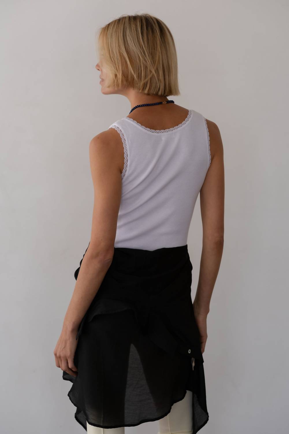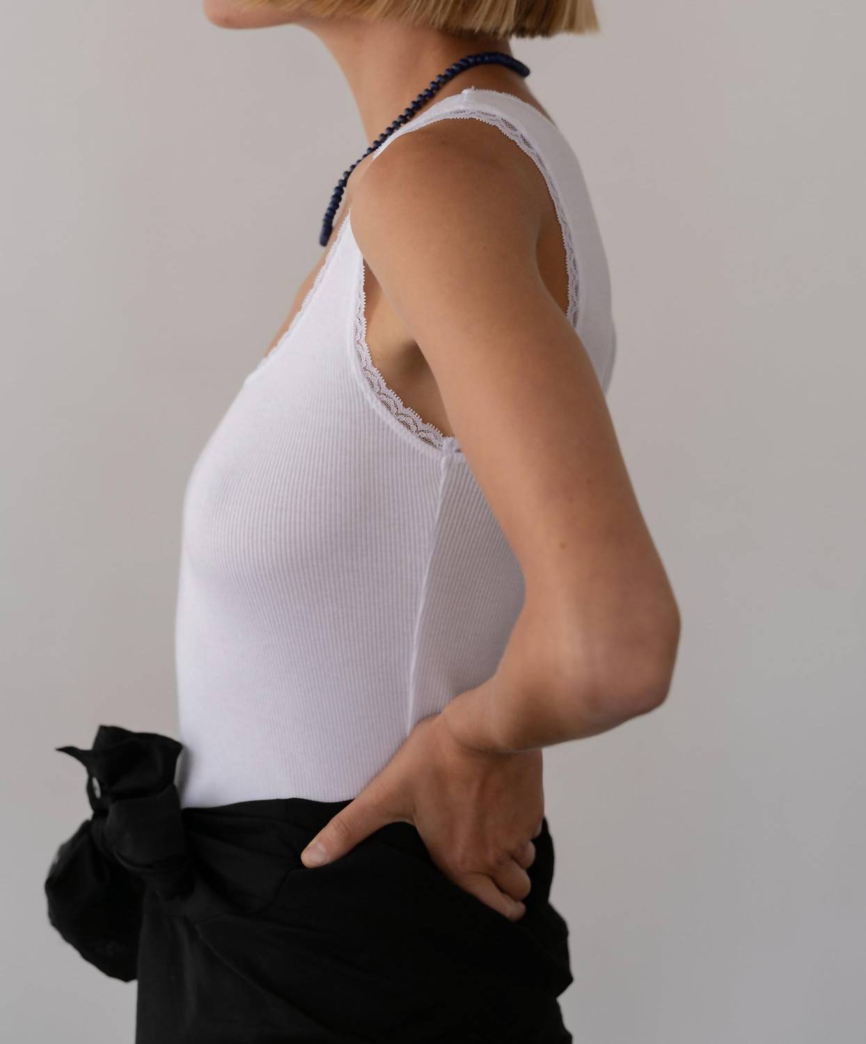 Elevate your summer vacation wardrobe with the Vintage Rib Lace Tank Top by DONNI. Crafted in Jet, this sleeveless tank top is made from pure cotton for a breathable, minimalist style. Featuring a flattering scoopneck, this pull-on design is ideal for warm weather getaways. Care instructions include machine washing and laying flat to dry for easy maintenance.