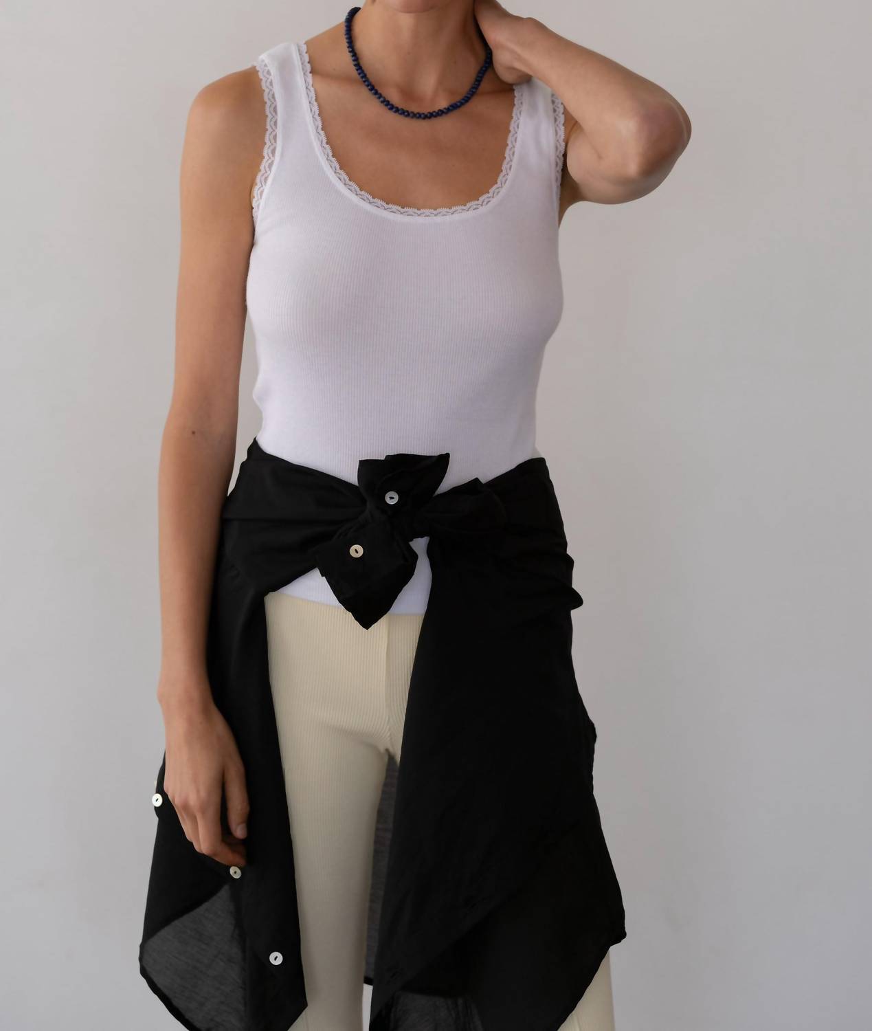 Fit, fabric and functionality. This tank top checks all the boxes. Elevate your summer vacation wardrobe with the Vintage Rib Lace Tank Top by DONNI. Crafted in Jet, this sleeveless tank top is made from pure cotton for a breathable, minimalist style. Featuring a flattering scoopneck, this pull-on design is ideal for warm weather getaways. Care instructions include machine washing and laying flat to dry for easy maintenance.