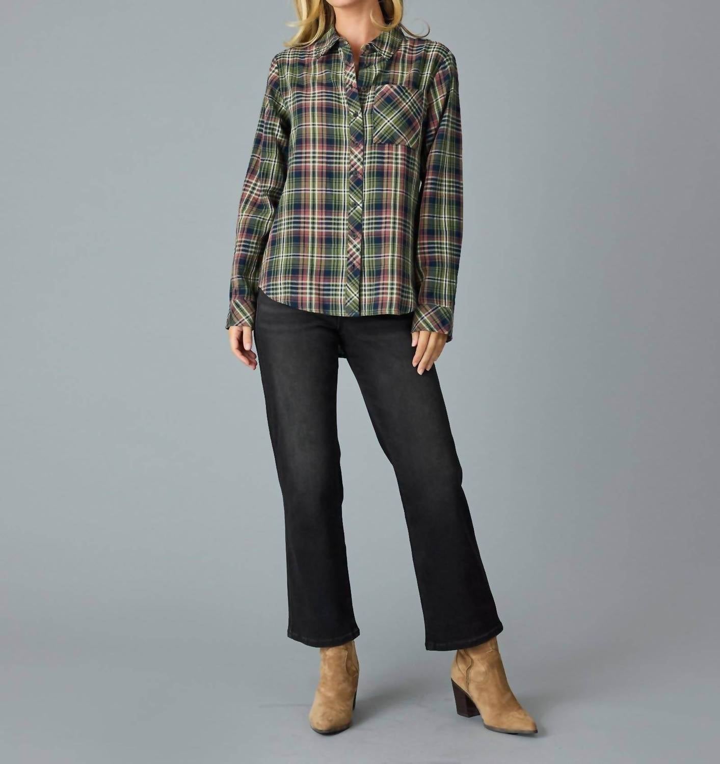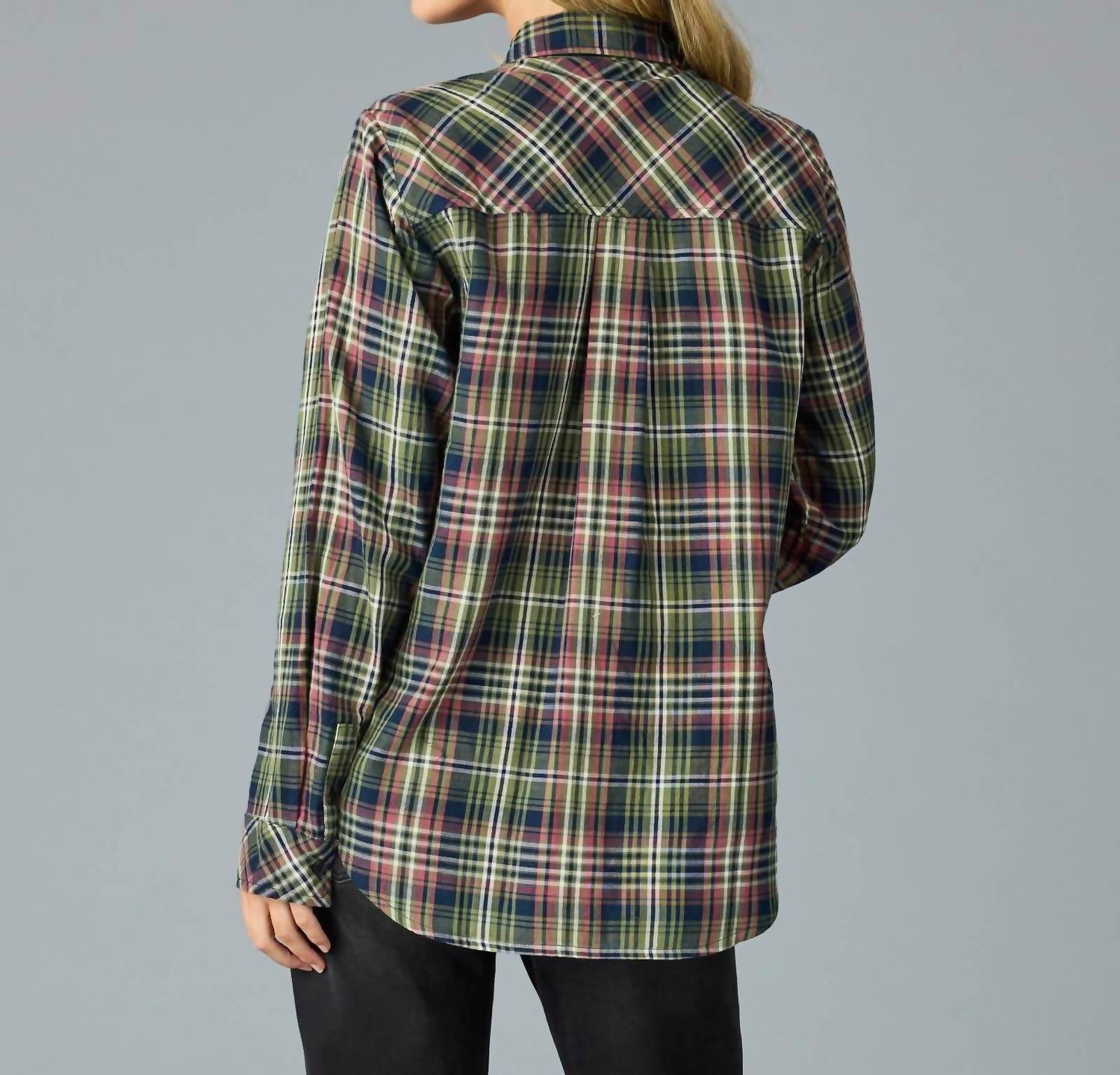 This button down shirt is comfortable yet polished. Introduce a touch of versatile style with the Sahna Shirt Top by DOWNEAST, offered in a navy combo plaid. This women's long sleeve button-down is made from 100% cotton, ensuring comfort from day to night. Measuring 29.5" in length, it features a classic collar and handy pockets for added functionality.