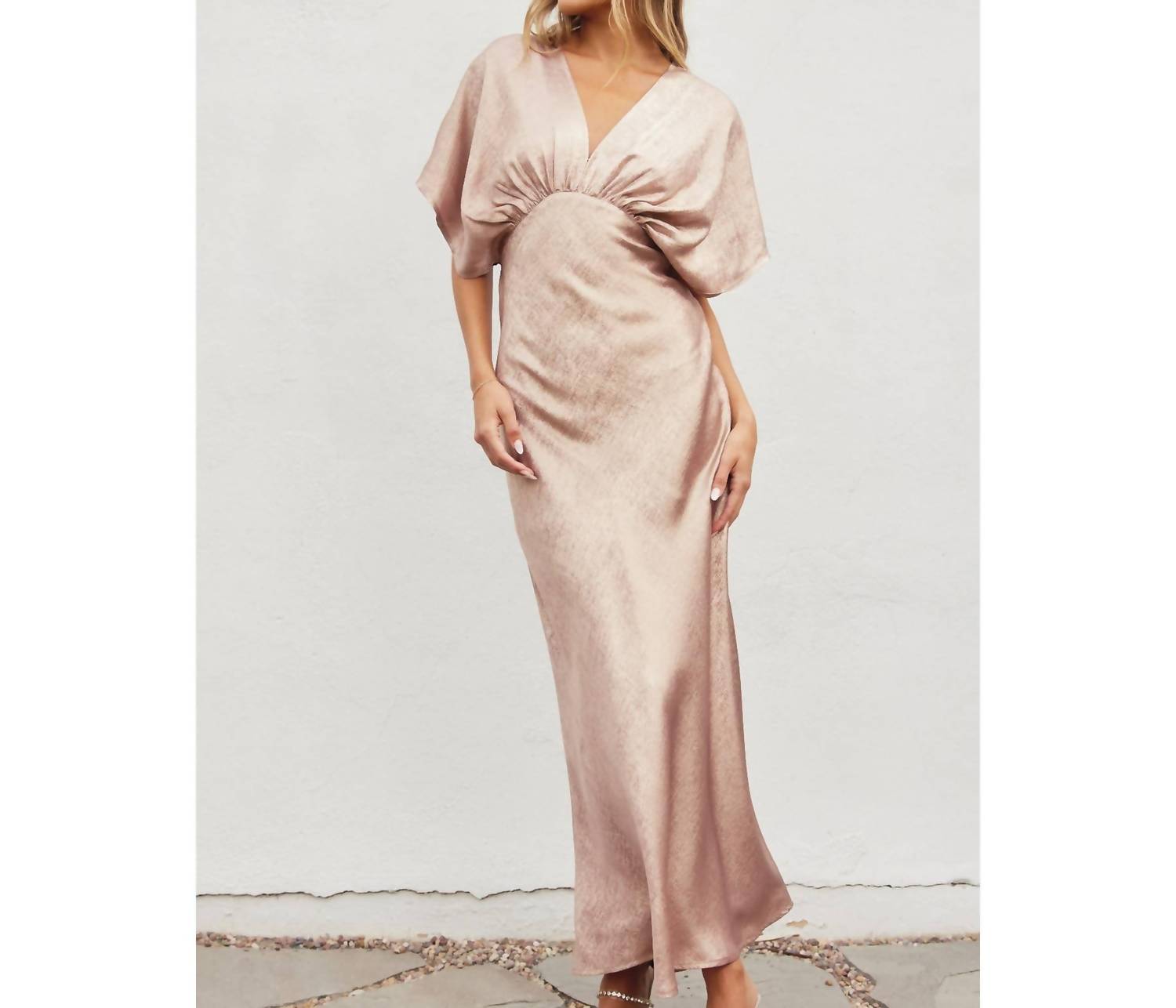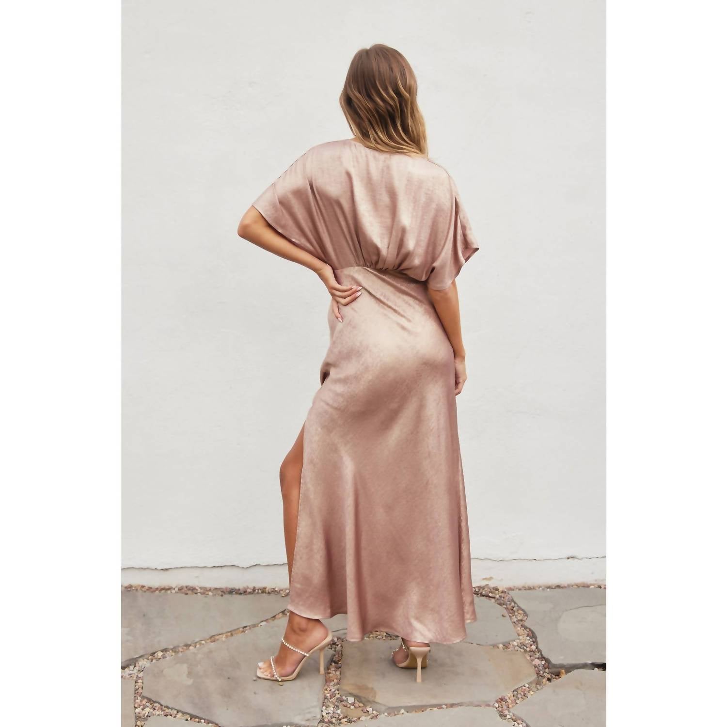 A maxi dress that is just as cute as it is comfortable. Introducing the Rosa Satin Maxi Dress by DRESS FORUM, a stunning choice for your spring wardrobe in a captivating Rose Pearl hue. This A-line dress features elegant cap dolman sleeves and a blouson top with a plunging V-neckline and hook and eye closure. Crafted with a solid pattern and a hidden side zipper, it promises a seamless silhouette, accentuated by a left side slit for added allure. Made from 100% polyester, both shell and lining, this dress requires hand washing and line drying to maintain its luxurious feel.