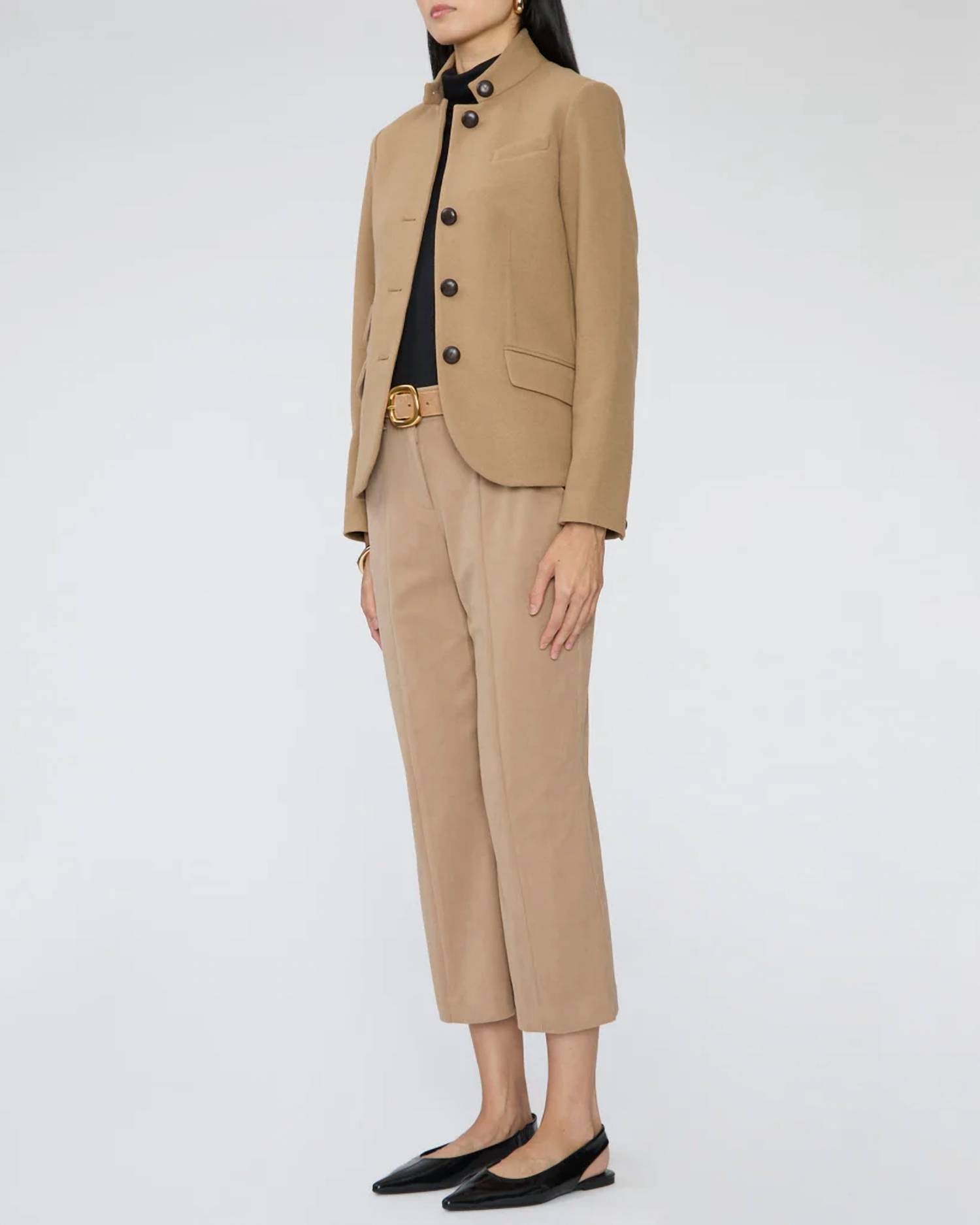 Meet the Jordan Blazer by DREW, a chic addition to your workwear wardrobe in elegant camel color. Designed with long sleeves and a mock collar, this blazer is made from 80% polyester, 10% viscose, and 10% acrylic. It features practical front flap pockets and a sophisticated front button closure, complete with single-button cuffs. Care instructions suggest dry cleaning only, ensuring you wrap the button with foil before cleaning.