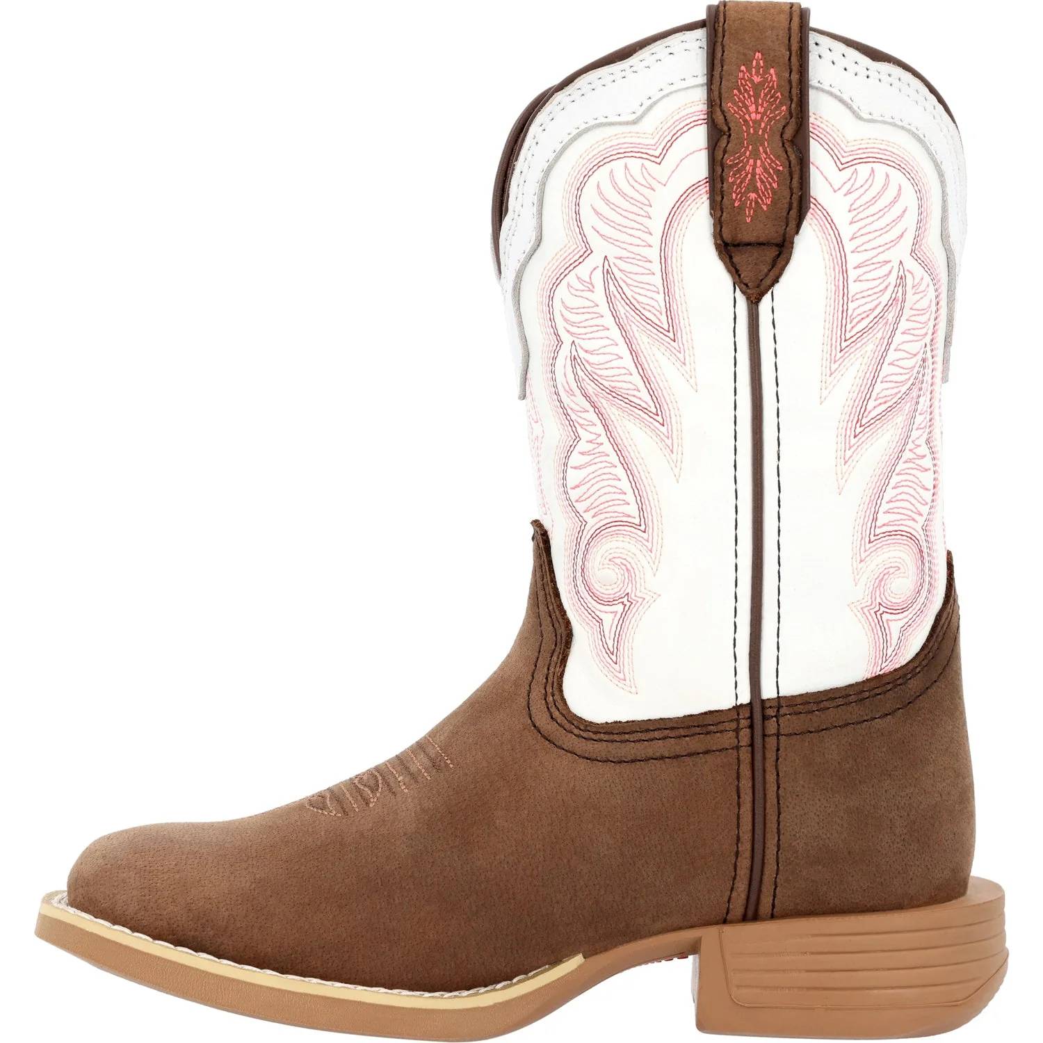 Introducing the Kids Lil Rebel Pro Boot by Durango Boots, a stylish and sturdy choice for young adventurers. Designed with a full-grain leather foot and collar complemented by a faux shaft, these boots promise durability and comfort. Featuring an 8-inch shaft height, 1-inch heel height, square toe, and a rubber outsole, they're perfect for both play and everyday wear. Inside, the Cushion Flex insole and soft mesh lining ensure a comfortable fit, complete with a fiberglass shank for support and a double row sole stitch for added durability.