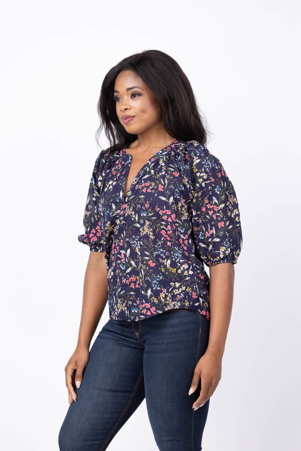 Introducing the Anna Top by Dylan, a stylish choice for summer with its flattering three-quarter sleeves and v-neck design. Crafted from 100% cotton, this blouse offers breathable comfort in a navy tone with a refined floral pattern. The pull-on closure ensures easy wear, while its minimalistic design fits effortlessly into both casual and professional wardrobes. Perfect for vacation and everyday elegance, the Anna Top embodies the marriage of natural fabric benefits with elegant style.