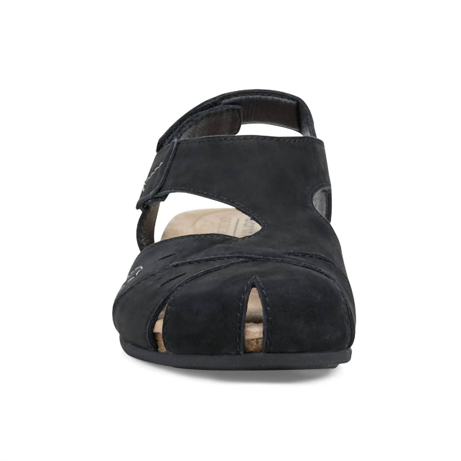 Step into comfort with the Birdine Casual Round Toe Slip-on Sandals by EARTH, crafted for women using recycled materials in chic black. Featuring a thoughtfully designed footbed with memory foam, these sandals provide long-term comfort with a low heel height of 1.26 inches and a platform height of 0.87 inches. They offer dual hook and loop closures, ensuring an adjustable fit for easy on and off access. Recommended fit is a half size down, and the sandals showcase a round toe and flat heel design.