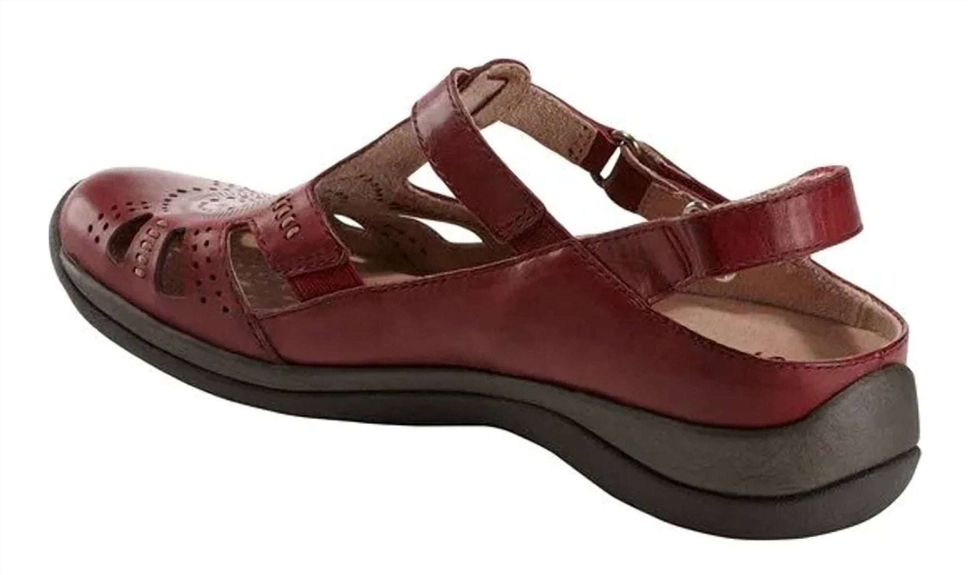 Introducing the Women's Kara Curie Leather Cutout Sandal by Earth in a rich Bordeaux hue, perfect for both style and comfort. These sandals feature a premium leather upper with an intricate cutout design, complemented by a glove-soft leather lining for a luxurious feel. With two adjustable Velcro closures, they offer a secure fit, while the exclusive dual-density footbed and Earth® PowerPath™ system ensure superior shock absorption and support. Heel height is 1.75 inches, providing just the right amount of lift for all-day wear.
