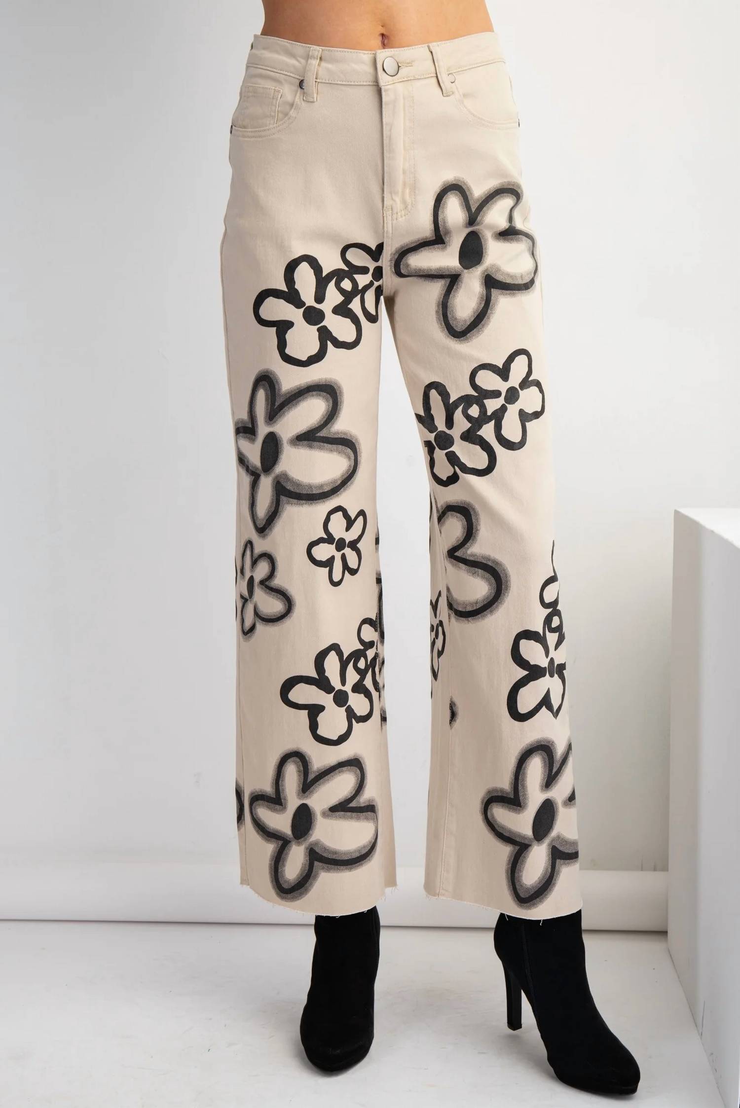 Introducing the Flower Print Washed Wide Pants by Easel, a stylish choice for the woman looking to make a statement in dusty sage. These high-rise pants feature a monochrome flower print with a wide leg fit, offering a stretchy, relaxed, and loose silhouette for ultimate comfort. This piece is crafted with a 97% Cotton and 3% Spandex blend, complete with functional belt loops, plus front and back pockets, and a convenient zip closure. Ideal for fall and suited for travel, care for these pants with machine washing for easy maintenance.