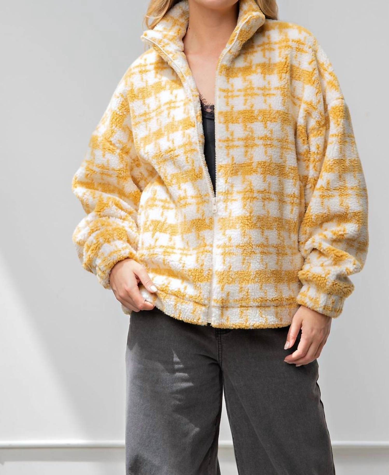 Cooler temps means cute puffer jackets and this one is a fan favorite. Wrap yourself in warmth and style with the Printed Faux Fur Zip Up Jacket by Easel in a lively yellow hue. Crafted from 100% polyester, this textured piece showcases a high neck collar and long sleeves, perfect for winter layering. Featuring a convenient zip closure and side pockets, this oversized jacket caters to a trendsetting, maximalist aesthetic. Care: Dry clean only.