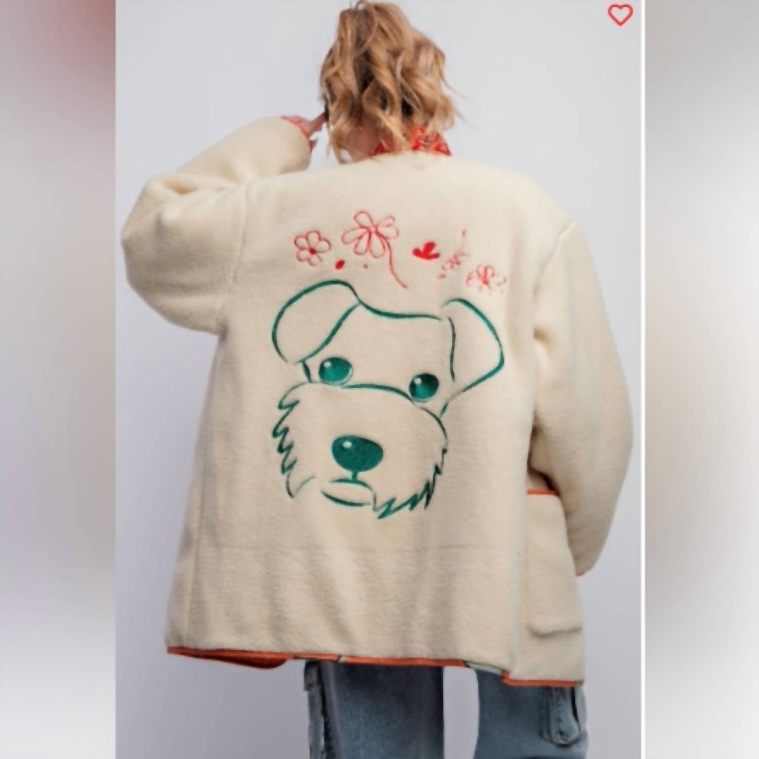 Easel's Scribbly Stars Reversible Puffer Jacket is stylish and fun. One side is a quilted green background with gold stylized stars and deep pockets; or go with reverse - a light sherpa with an embroidered dog and flower design.