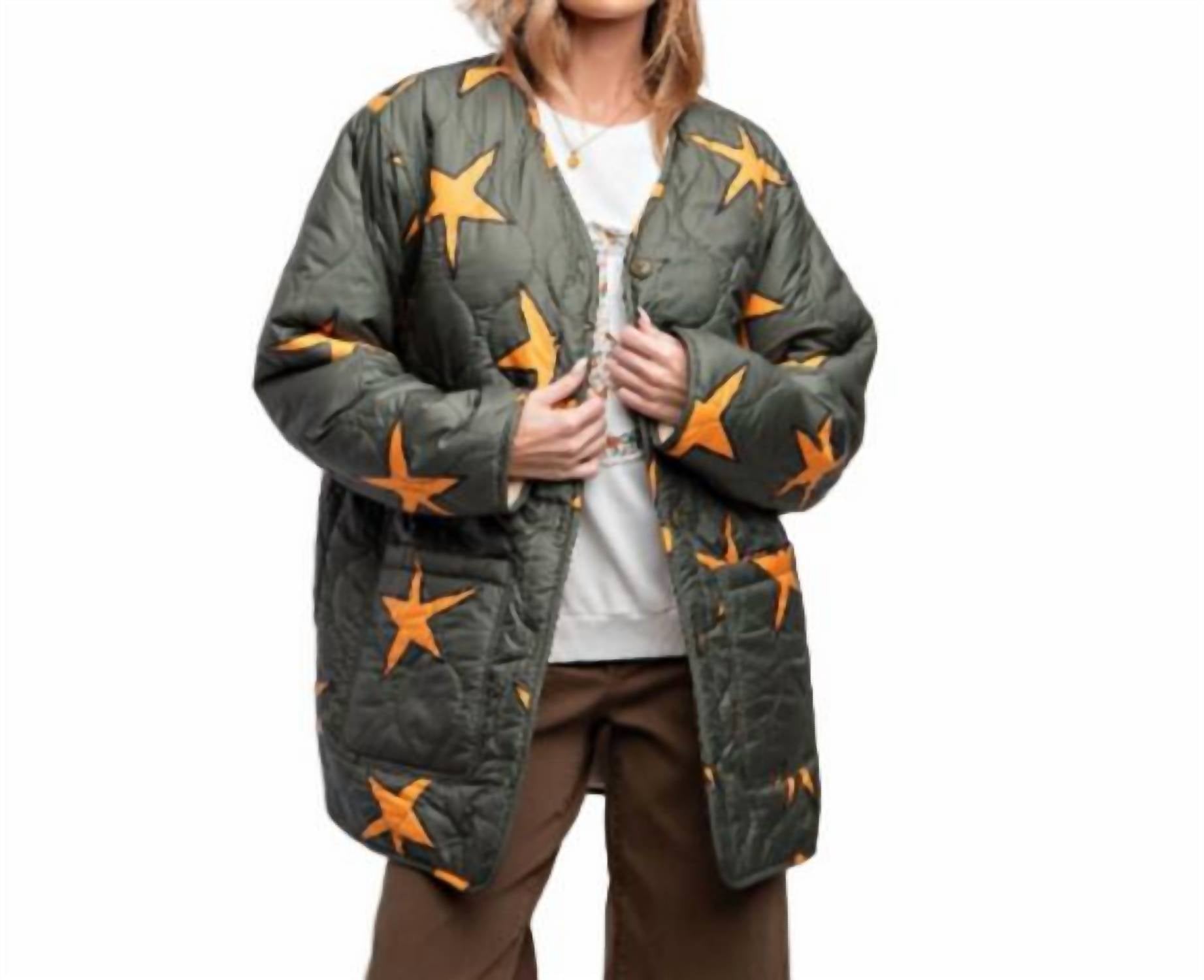 A casual yet cool jacket that every closset needs. Easel's Scribbly Stars Reversible Puffer Jacket is stylish and fun. One side is a quilted green background with gold stylized stars and deep pockets; or go with reverse - a light sherpa with an embroidered dog and flower design. Hand wash cold. Hang or line dry.