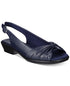 Sandálias sociais estilo slingback com bico redondo e tiras finas | Fecho de fivela ajustável com tira na parte de trás; palmilha acolchoada para maior conforto; detalhes franzidos na biqueira | 1 salto | Disponível em estreito (N) | médio (M) | largo (L) | e duplo largo (WW)