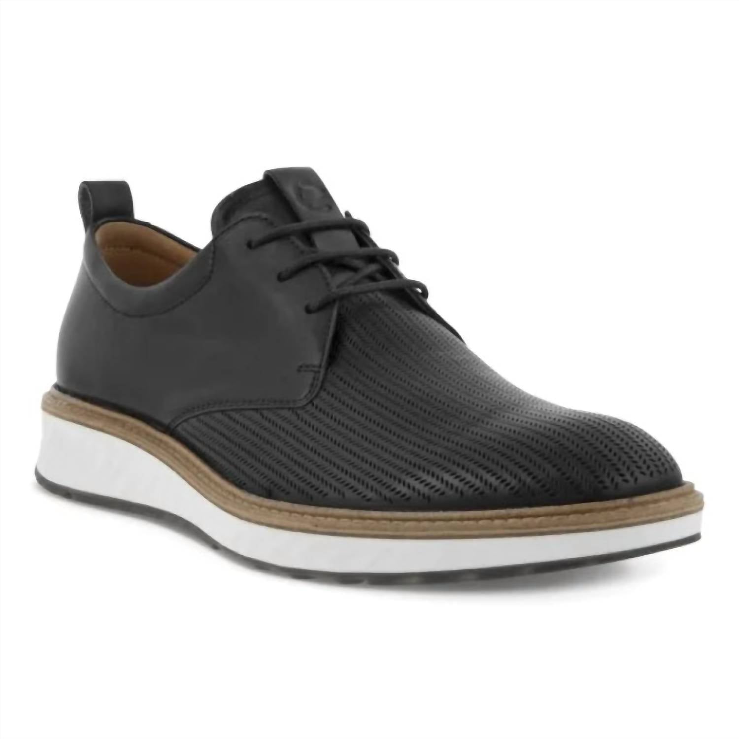 Meet the ECCO Men's St 1 Hybrid Sneaker, a sleek black shoe blending a sneaker's comfort with classic suit style, perfect for a dinner party or Thanksgiving gathering. Crafted from premium leather produced in ECCO's own factory, it features an innovative SHOCK THRU technology that absorbs shock with each step. The molded leather insole and breathable textile and leather lining ensure a comfortable fit, while the PHORENE™ midsole provides all-day cushioning. With a 30mm heel height, its lightweight sole, enhanced by FLUIDFORM™ technology, offers excellent flexibility and support.