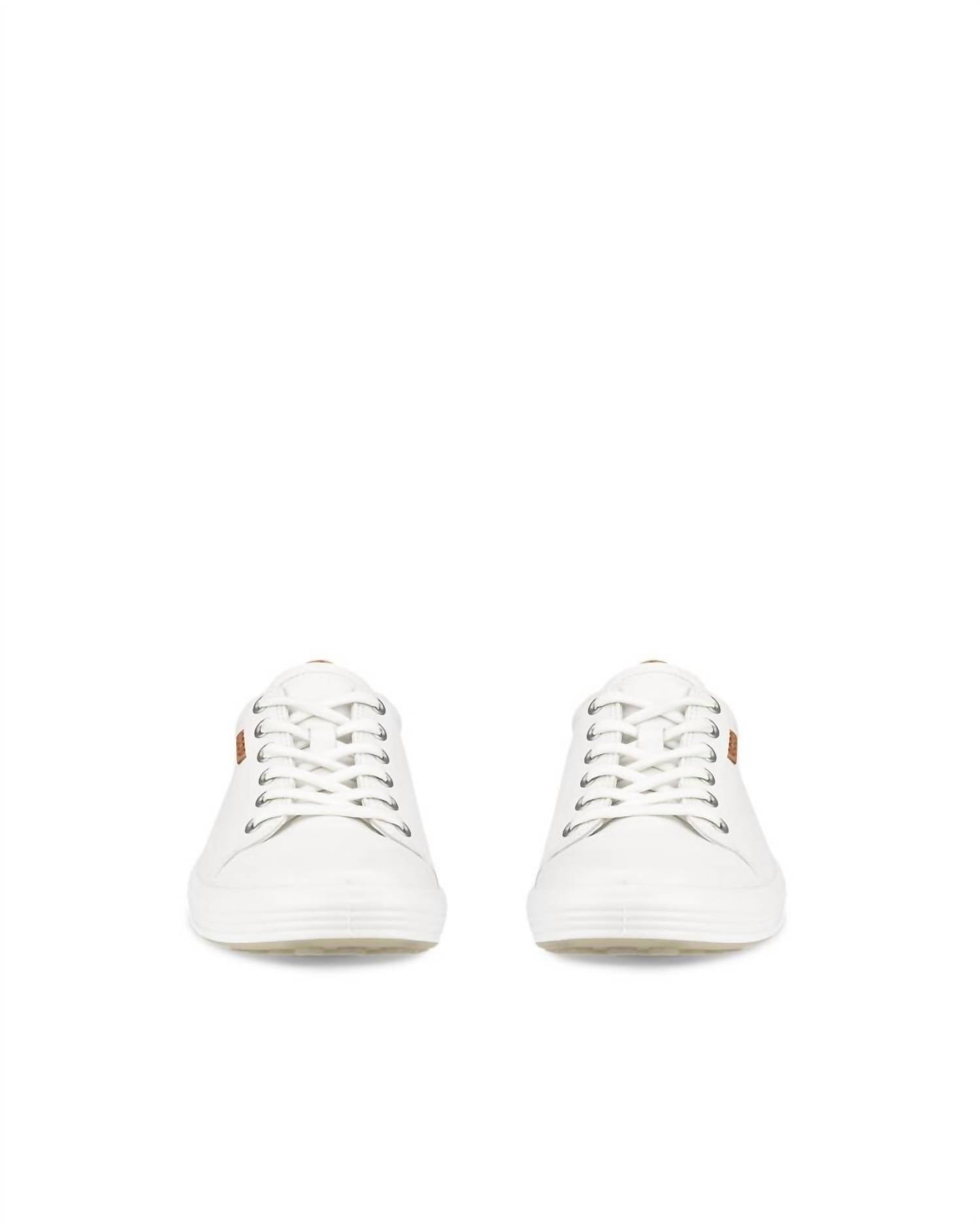 Cute, functional, and comfortable. These sneakers check all the boxes. Experience the classic Scandinavian design with the Women's Soft 7 Leather Sneaker by ECCO, crafted from rich full-grain and nubuck leather for a modern minimalist appeal. This sneaker offers a comfortable fit with its full anatomical last shape and is ideal for different terrains, thanks to its dimpled PU and TPU outsoles providing excellent grip. Equipped with a leather-covered inlay and removable ECFS™ inlay sole, these sneakers ensure flexibility and a perfect inner climate with their soft textile lining. Proudly featuring a flat heel design, these sneakers in crisp white are your perfect summer travel companion.