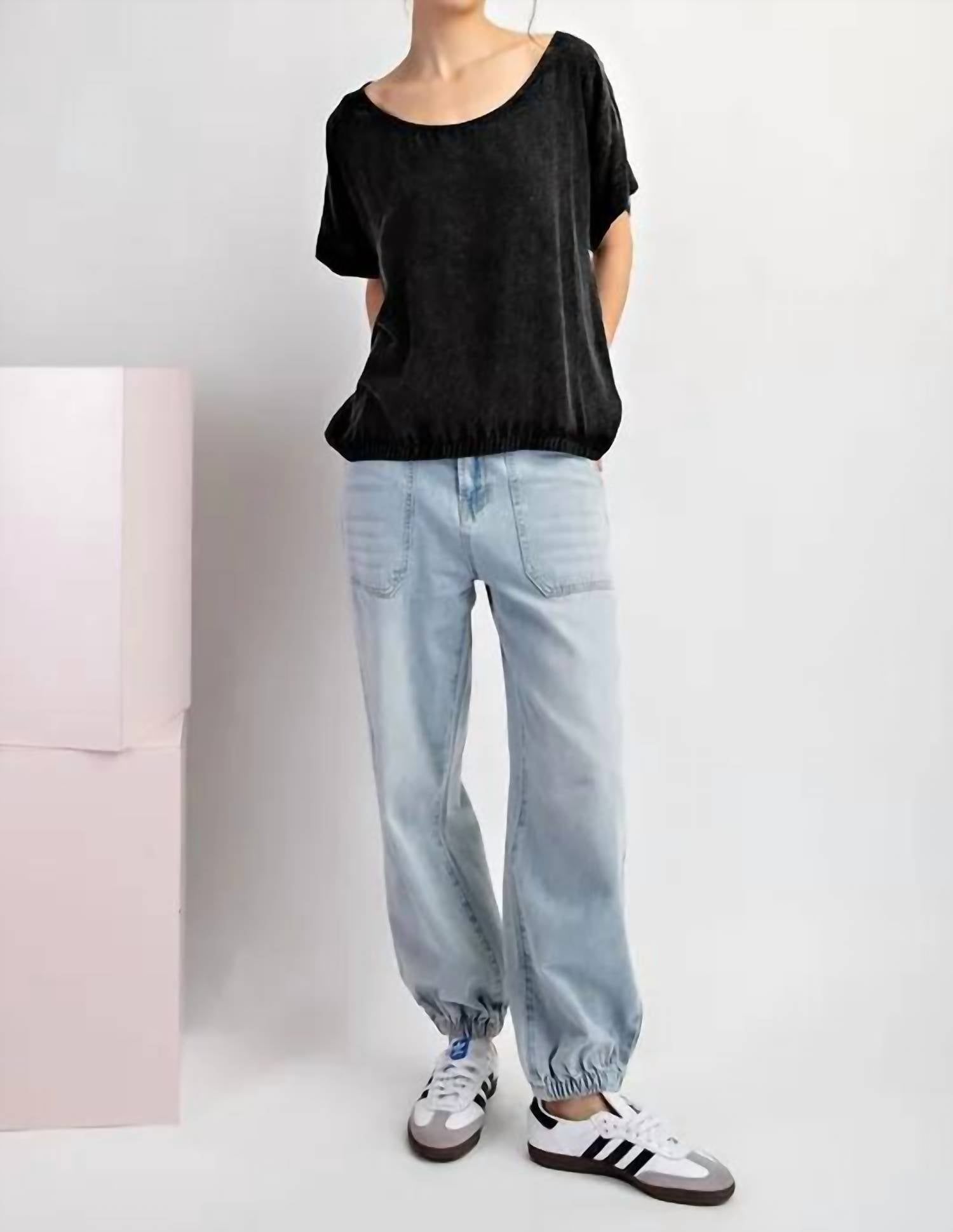 Introducing the Cool & Casual Off Shoulder Top by ee:some, a minimalist blouse crafted from 100% Rayon. Featuring an off-the-shoulder neckline and short sleeves, this solid black top is perfect for spring evening events. With a banded hem and a convenient pull-on closure, it offers both style and ease of wear.