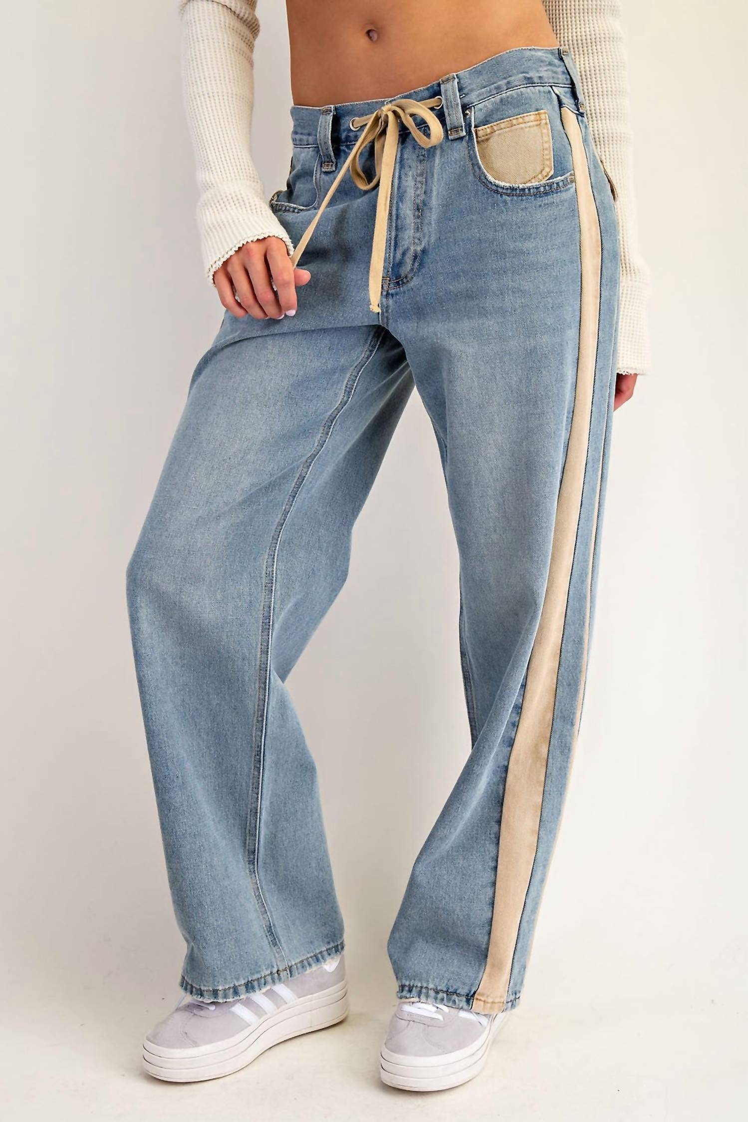 Pair these straight leg jeans with flats, sandals or even heels! You can't go wrong. Meet the ee:some Mineral Washed Drawstring Side Stripe Jeans, a playful and stylish addition to your denim collection. These straight leg jeans, designed for women, feature a unique mineral wash finish and eye-catching side stripes. Made from a comfortable cotton blend, they offer a relaxed fit with a low-rise waist and button closure. With a 29-inch inseam, these jeans combine trendy streetwear vibes with ultimate comfort—a perfect pick for your next holiday party.