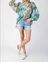 Elevate your wardrobe with the Printed Blouse by ee:some, showcasing a geometric pattern in beautiful Juniper Green. This long sleeve blouse offers a crewneck design and button cuffs that create an elegant bubble sleeve effect. It features a relaxed, flowy fit with intricate pleats and a convenient pull-on closure. Care instructions include hand washing and line drying to maintain its vibrant look. Model is 5'8" and is wearing a size small.