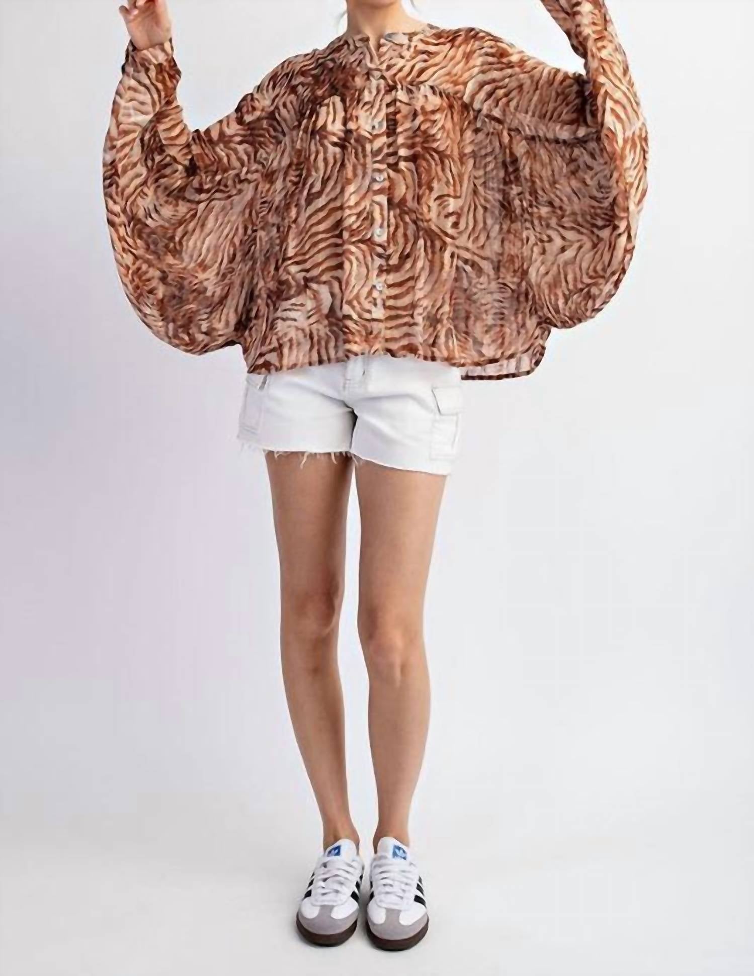 Pair this with your favorite jeans and slides for your next girls night out. Elevate your wardrobe with the Printed Dolman Sleeve Top by eesome, a tiger-striped blouse that brings a sophisticated edge with its button down front. This long-sleeve blouse is made from 100% polyester and features dolman sleeves that offer a comfortable and stylish fit. The mockneck design lends an additional layer of elegance, perfect for springtime occasions like Thanksgiving or anniversaries. Care is simple with hand wash and line dry instructions, ensuring your top stays in top condition.