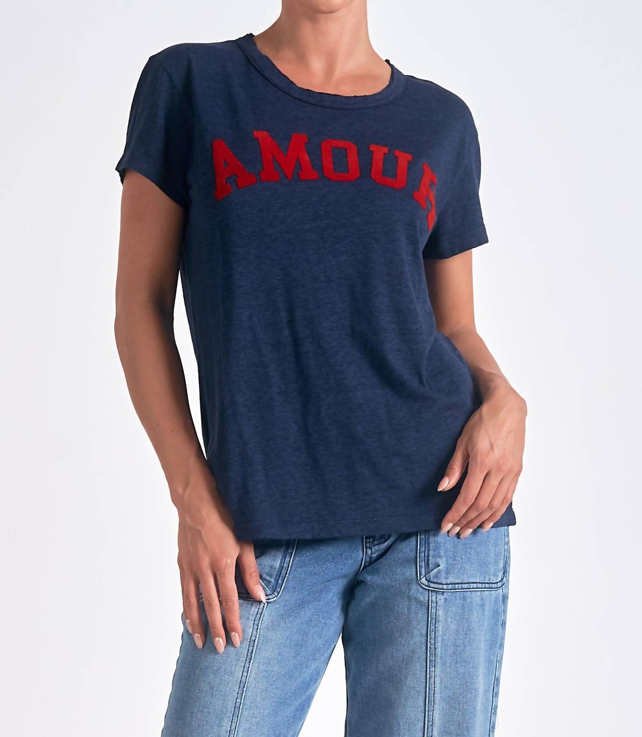 Apresentamos a Camiseta Amour Crew Neck da ELAN, uma adição estilosa e sem esforço ao seu guarda-roupa. Desenhada com mangas curtas e confeccionada em uma mistura confortável de 50% algodão e 50% viscose, esta camiseta azul-marinho apresenta letras em veludo vermelho ousadas para um visual marcante. Seu fecho pull-on e o design clássico de gola redonda a tornam prática e elegante. Ideal para qualquer passeio casual, esta camiseta combina apelo gráfico com conforto para o dia a dia.