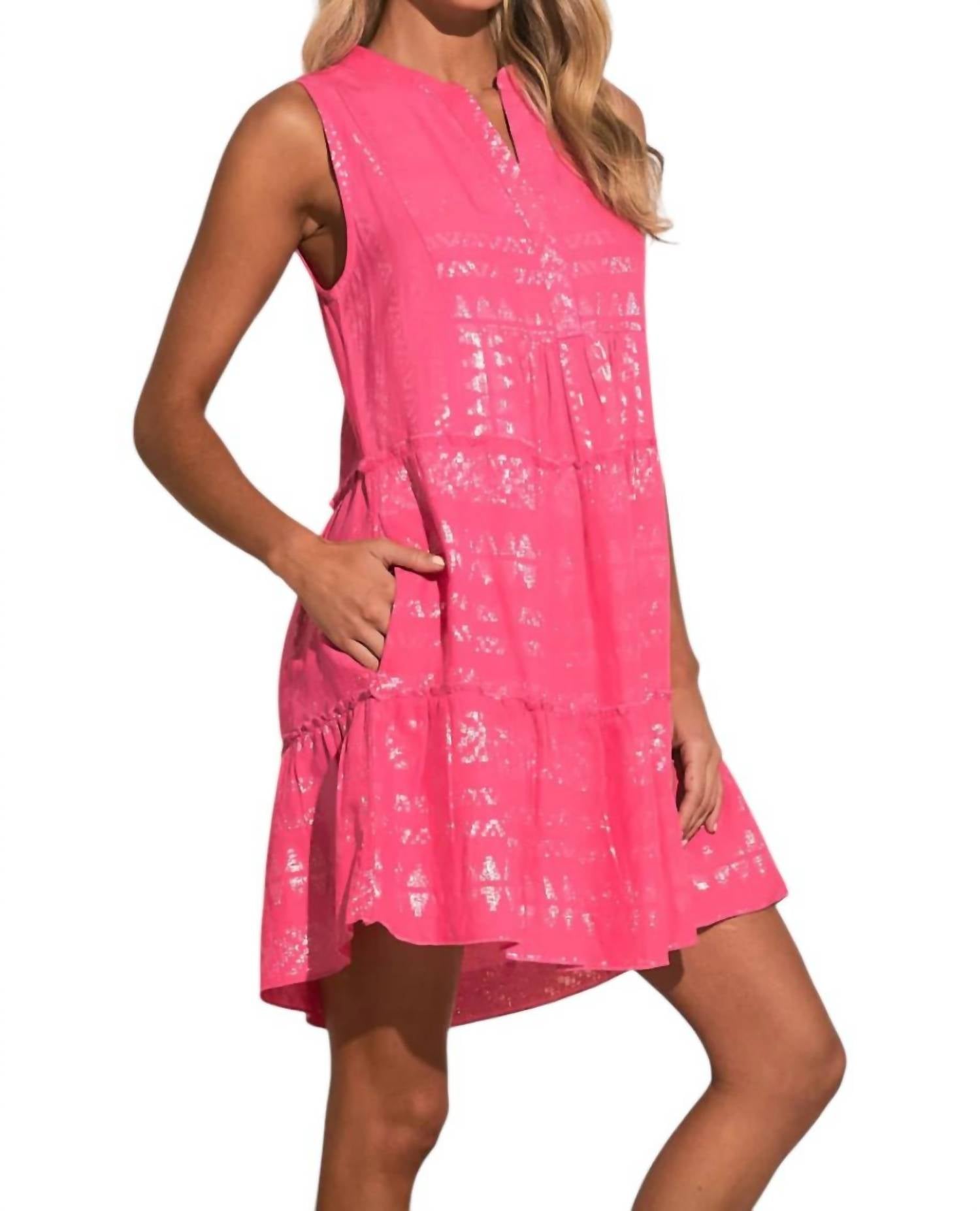 O minivestido perfeito para os meses mais quentes. Este minivestido apresenta um padrão jacquard que captura a luz, uma meia-carcela com botões ocultos e uma gola de faixa. É sem mangas, com bolsos laterais e sem forro. Feito de 47% algodão, 47% viscose e 6% fibras metálicas. Comprimento de 86 cm (tamanho médio). Lavar à mão.