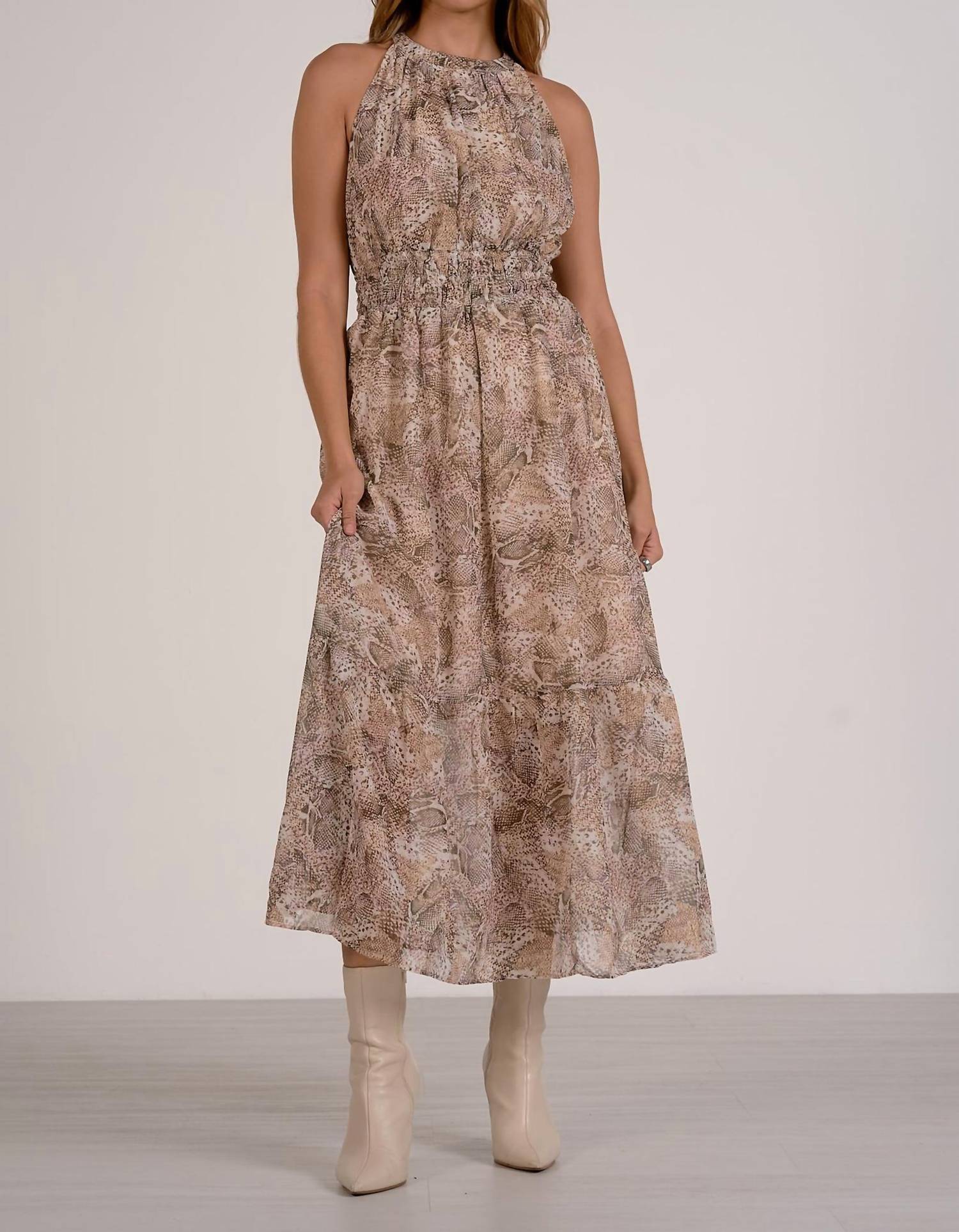 A maxi dress that is just as cute as it is comfortable. Introducing the Cara Dress by ELAN, a statement piece in a captivating Natural Snake pattern. This maxi dress showcases a halter neckline with a flattering empire waist design, highlighting the shoulders beautifully with its sleeveless cut. Expertly crafted from polyester, it embodies both comfort and elegance, making it perfect for any holiday party, especially Thanksgiving. Embrace the boho chic trend this fall with this must-have addition to your wardrobe.
