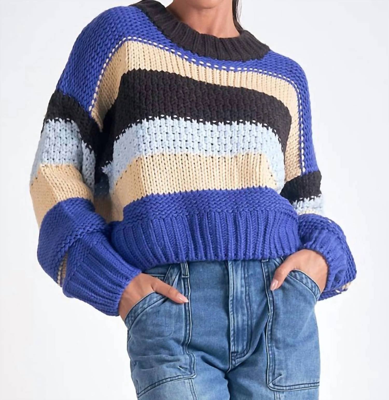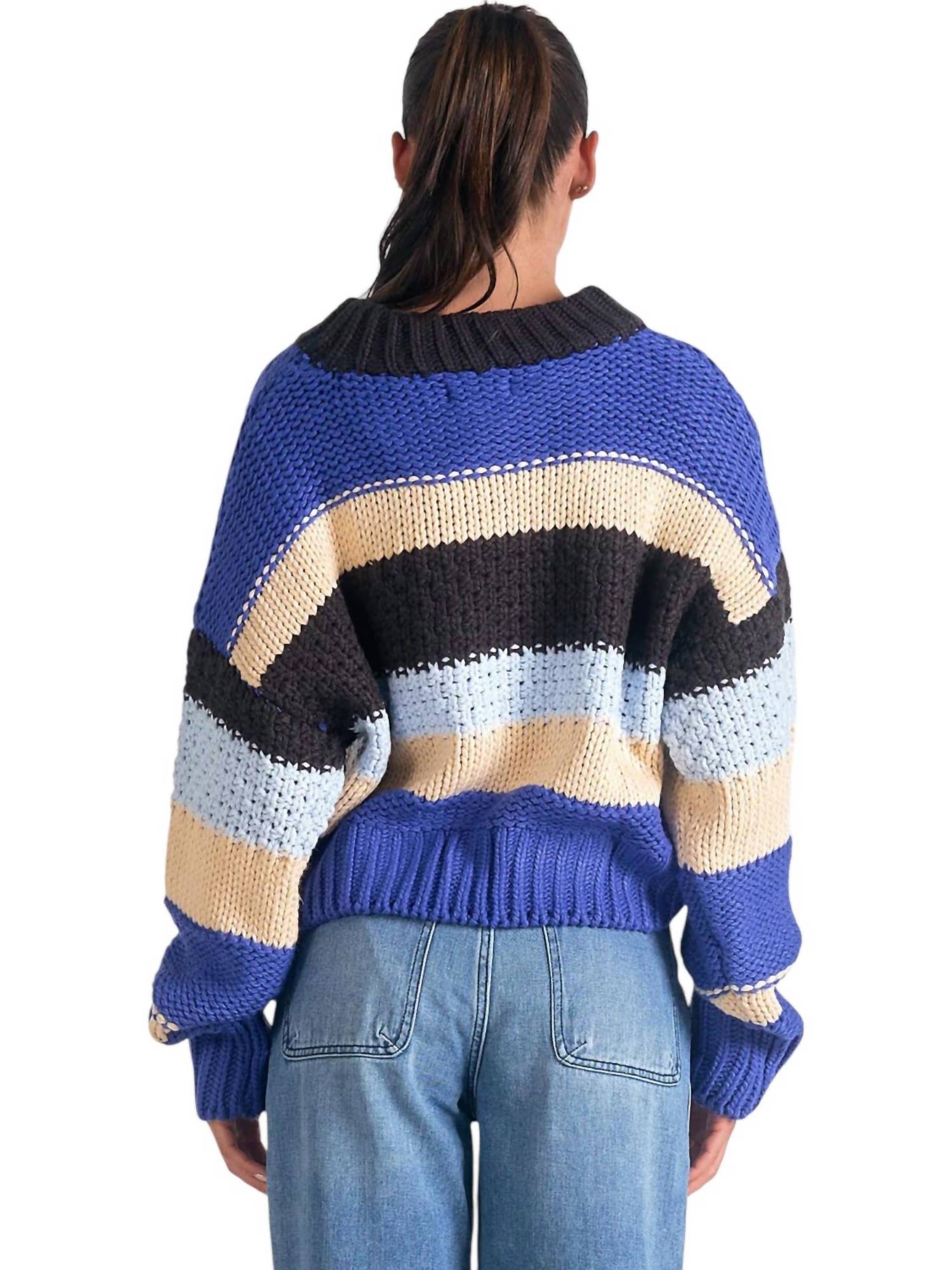 Gola redonda clássica e listras azuis vibrantes. Com mangas compridas. Suéter de malha aconchegante que incorpora uma estética casual chique. Feito com materiais de alta qualidade. Promete conforto e durabilidade. Fecho de puxar. Visual sem costuras e estiloso.