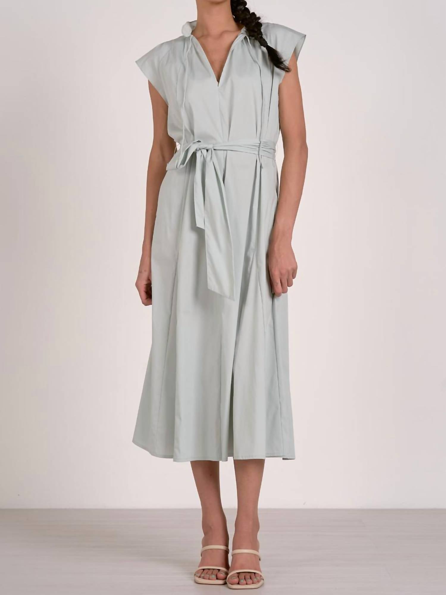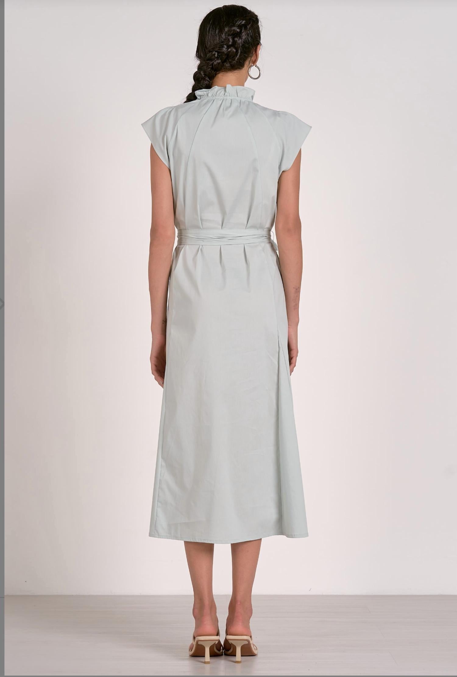 O Vestido Cecelia Mint com Mangas Curtas da ELAN oferece elegância e frescor para o seu guarda-roupa de primavera. Com um design sem mangas, este vestido-camisa é confeccionado em algodão leve em um tom cinza sólido. Seu comprimento midi, com botões frontais e cintura marcada, proporciona uma silhueta elegante, perfeita para reuniões na igreja. Instruções de cuidado não são especificadas.