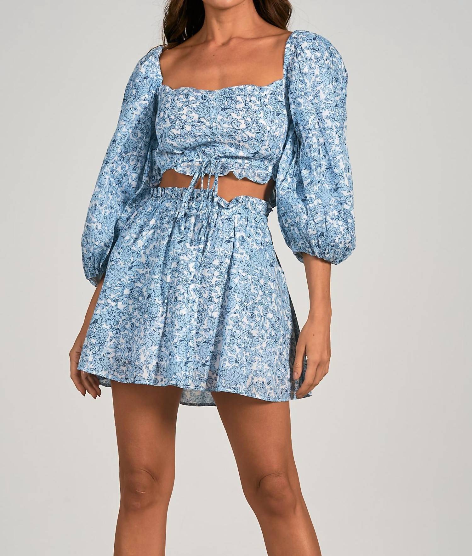 Mostre um pouco de pele com este top curto fofo e casual. Esta saia floral azul-claro e marinho tem bolsos laterais, forro interno e cós elástico. É fácil de vestir e perfeita para os dias casuais de verão. Combine com a blusa jeans Santa Fe Cinched da Elan para um look completo.