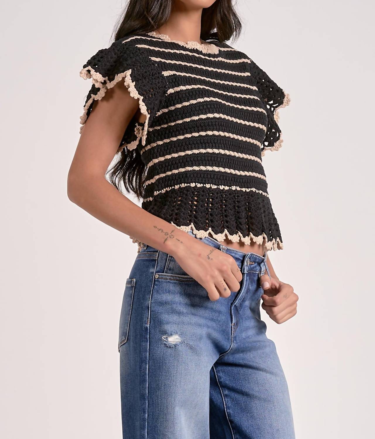 The ultimate go-to sweater, expertly crafted to provide the perfect combination of warmth and style. Its classic design and soft fabric make it a must-have addition to your wardrobe. Elevate your spring wardrobe with the Crochet Frills Top by ELAN, a charming piece in black and natural stripes for 90s-inspired style. This women's crewneck sweater features cap sleeves and a tie closure, showcasing a scalloped hem for added flair. Crafted from a cotton blend, it combines comfort and fashion effortlessly. Ideal for vacation occasions, this top is a trendy addition to any casual ensemble.