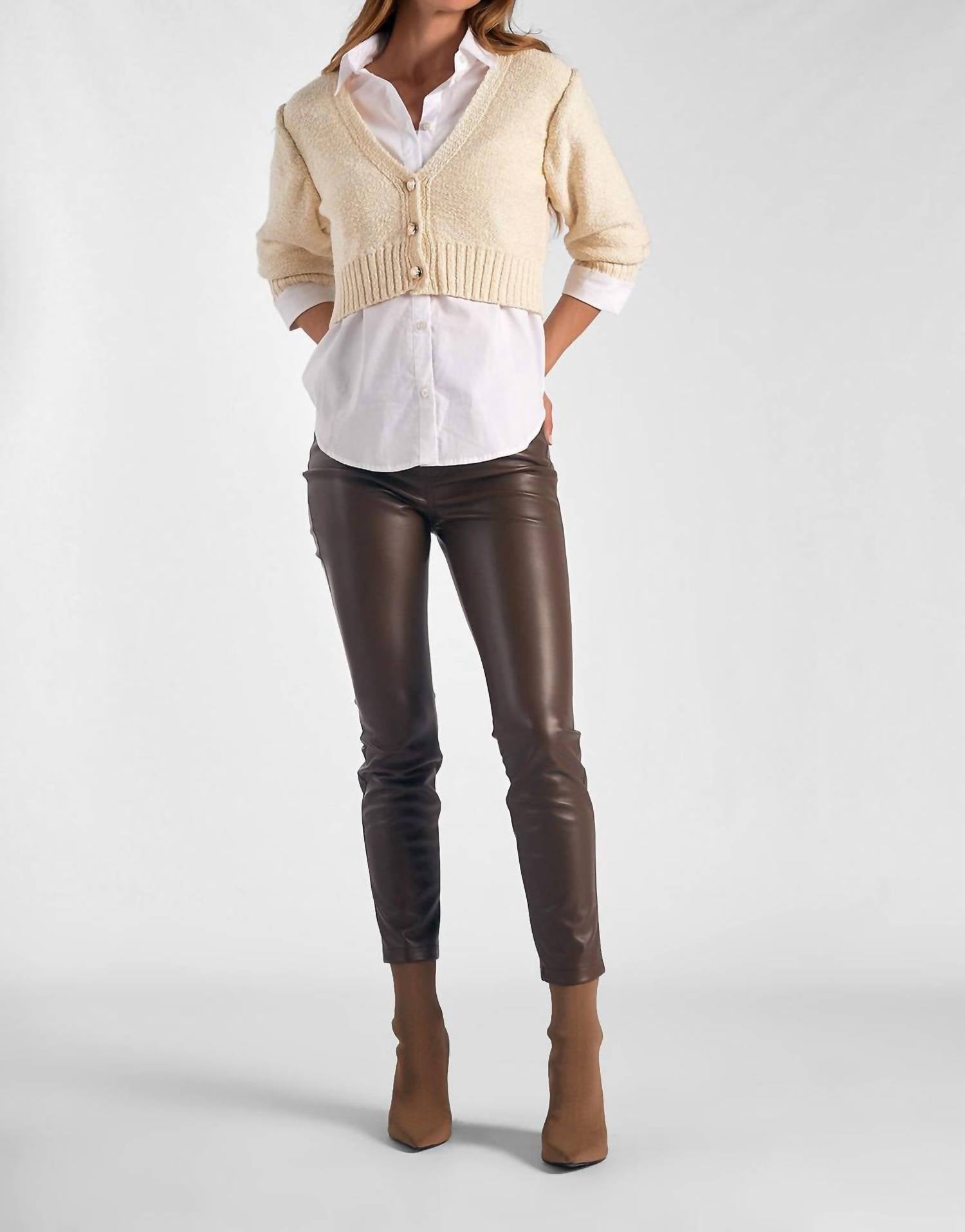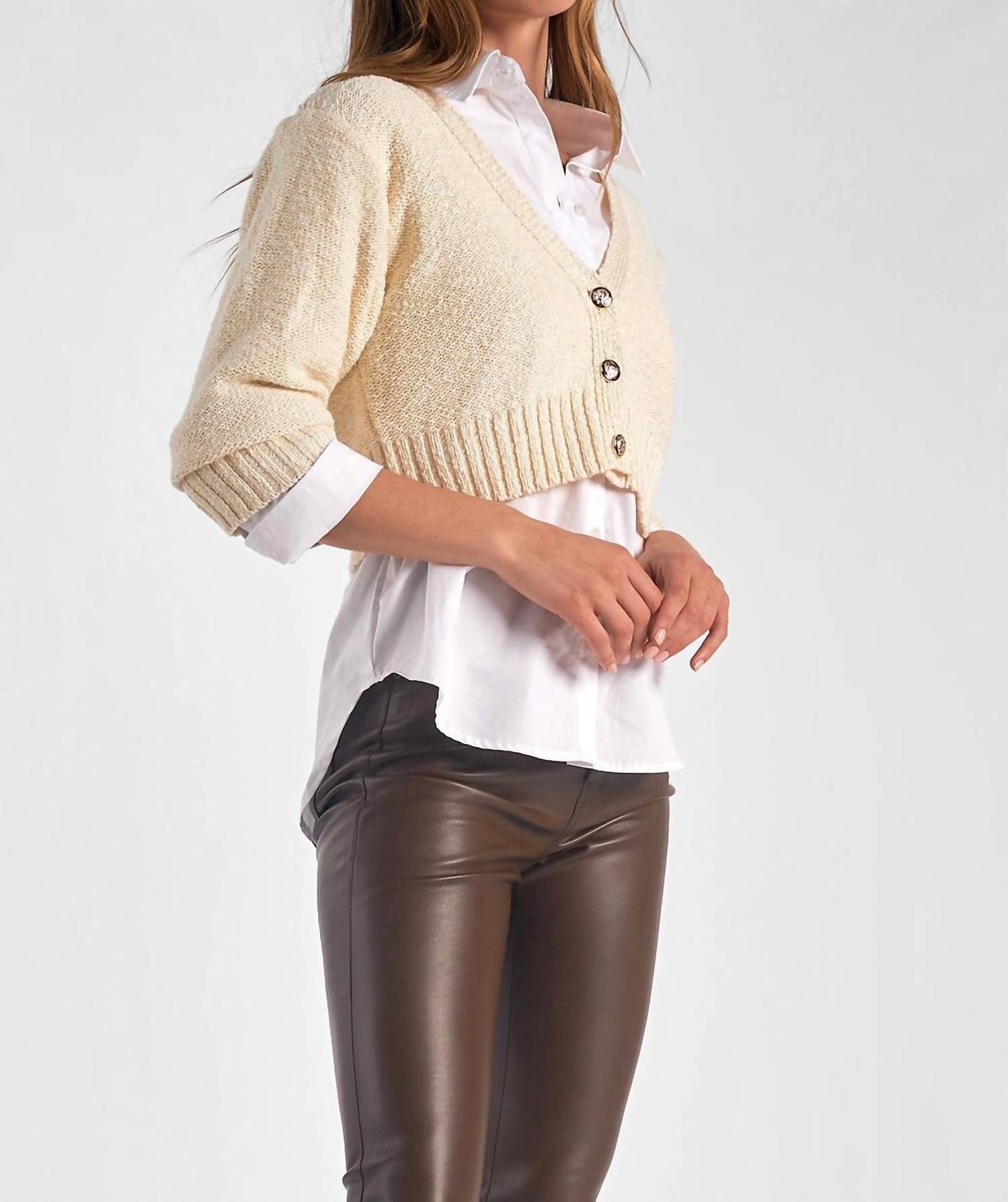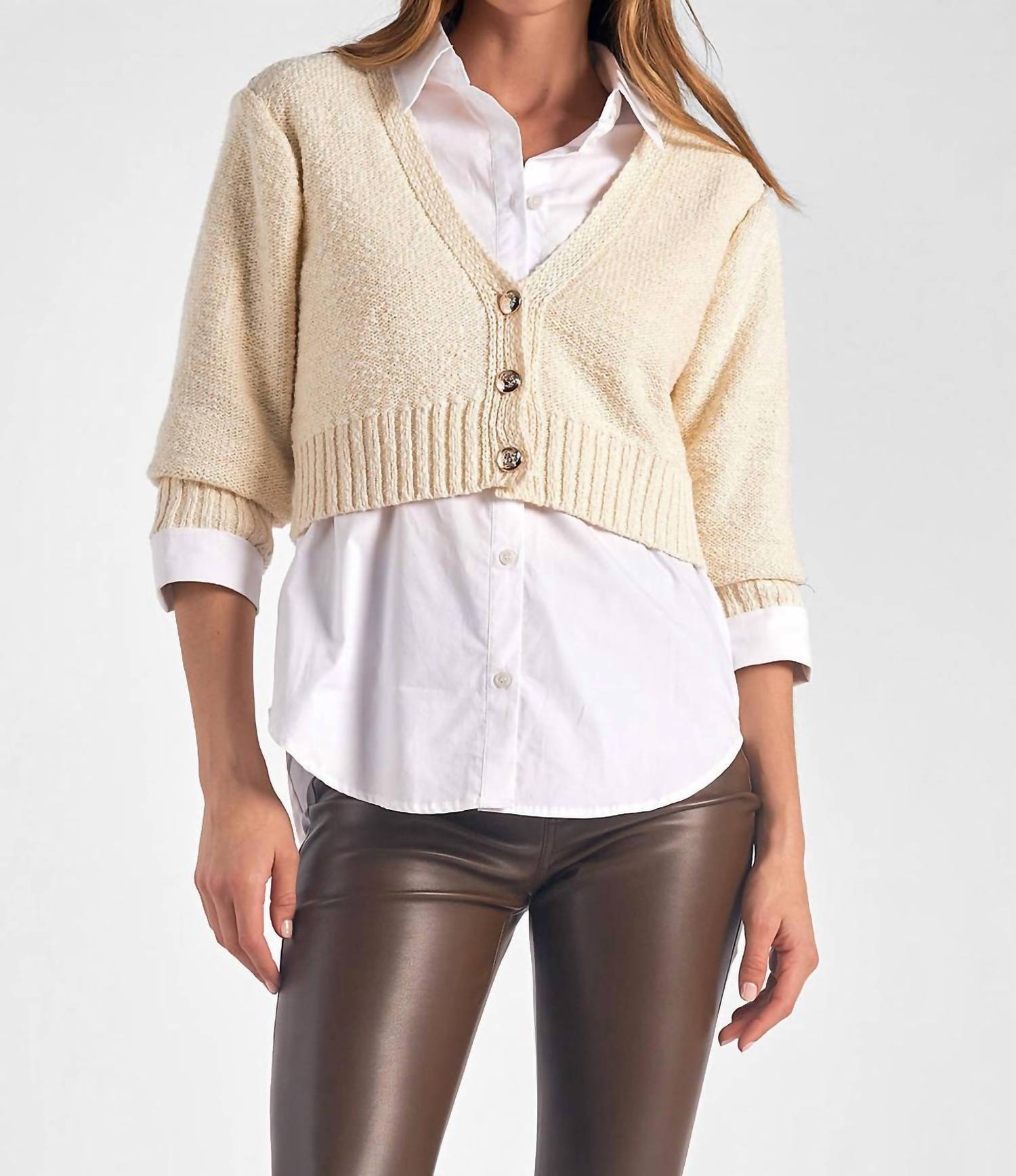 Eleve seu estilo com o Conjunto Crop Sweater da ELAN, com um elegante tom Off White e um design dinâmico em blocos de cores. Este conjunto inclui um cardigan cropped sobre uma camisa branca impecável com botões, ostentando um decote em V relaxado e mangas três quartos. Confeccionado em uma mistura de 60% algodão e 40% acrílico, e 100% algodão, garante conforto e um toque moderno. Fechamento: Botão. Cuidados: Lavar à mão. Esta peça versátil veste perfeitamente, com opções de tamanho maior para um caimento oversized ou menor para um visual mais personalizado.