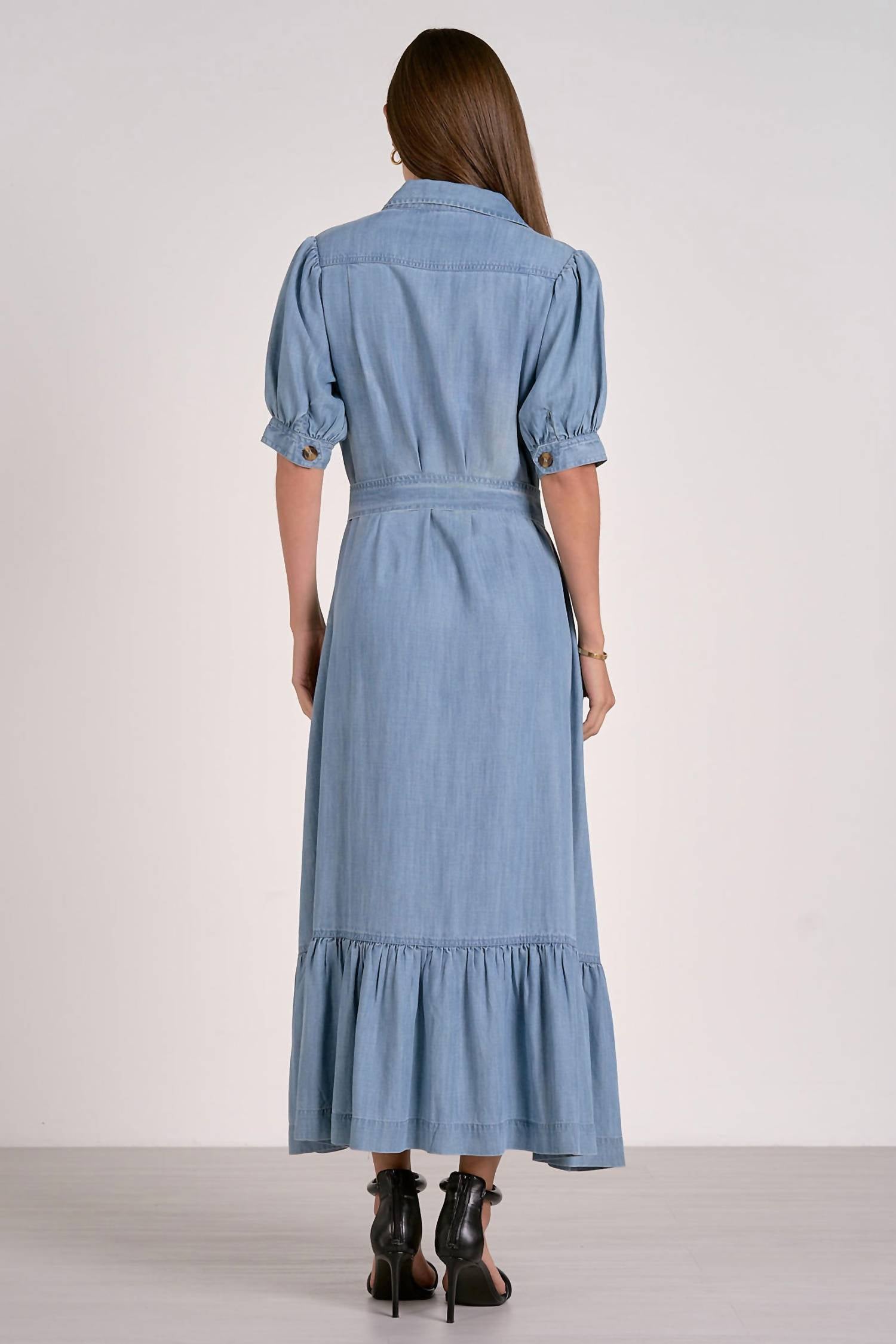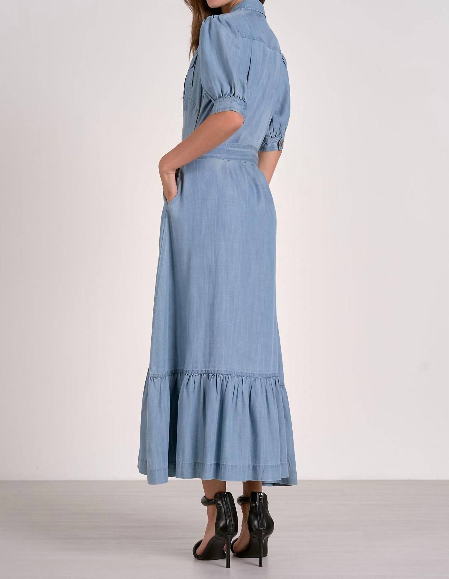 Um vestido longo que é tão fofo quanto confortável. Apresentamos o Vestido Demi Maxi da ELAN, uma escolha estilosa para qualquer ocasião com seu acabamento texturizado em azul jeans. Este vestido-camisa evasê apresenta mangas curtas, decote cavado e um design funcional com aba frontal e bolsos laterais. Confeccionado para conforto e versatilidade, inclui fecho frontal parcial por botões, cinto próprio e bainha com babados para um toque de elegância. As instruções de cuidado recomendam lavar à mão e secar no varal para manter a qualidade desta peça estilosa.
