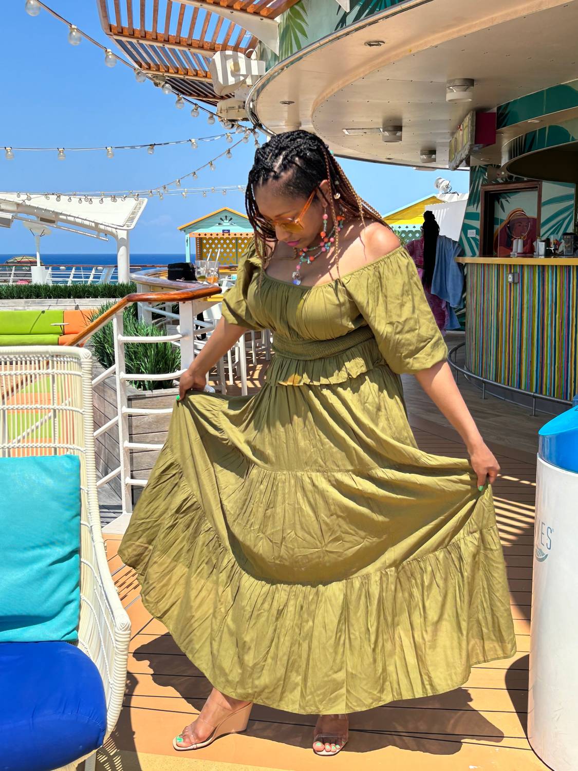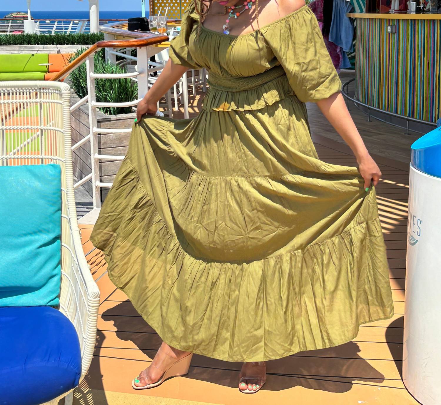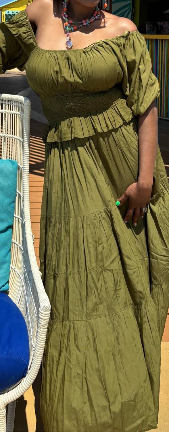 Um vestido longo que é tão fofo quanto confortável. Apresentamos o Vestido Maxi Verde-oliva Dirty Martini da ELAN, uma escolha sofisticada tanto para eventos diurnos quanto para o início da noite. Este vestido elegante apresenta um decote ombro a ombro com mangas curtas, complementado por uma silhueta em A que oferece fluidez de movimento.