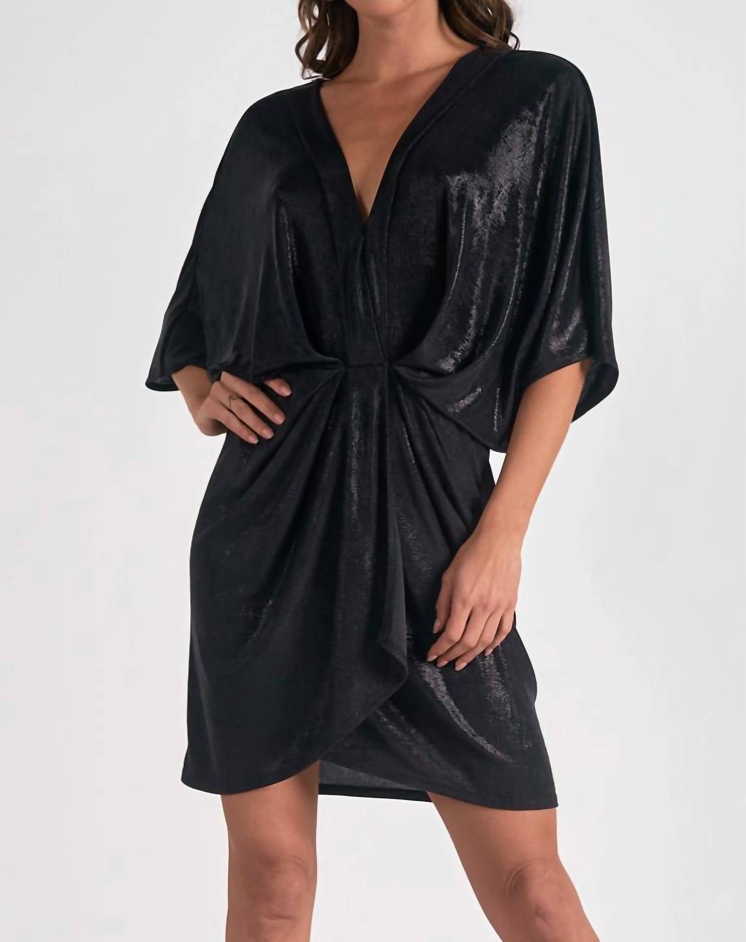 O vestido com o comprimento perfeito existe. Decote em V com mangas dolman modernas. Cintura franzida e torcida para uma silhueta elegante. Tecido metálico brilhante luxuoso. Perfeito para uma declaração brilhante. Projetado para estilo e conforto.