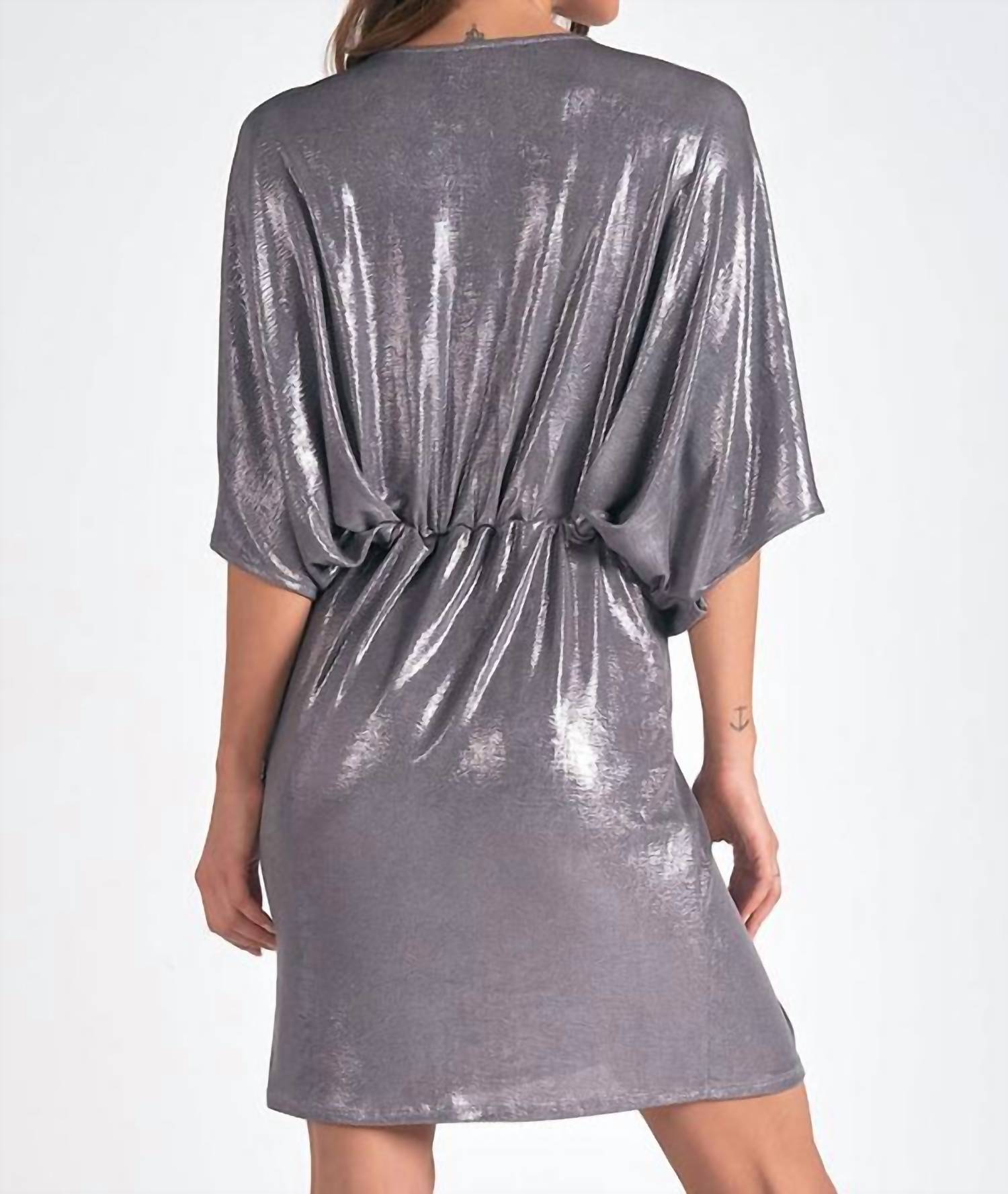 Este vestido curto apresenta um sofisticado decote em V complementado por modernas mangas dolman três quartos. Confeccionado em um luxuoso tecido metálico, ele brilha a cada passo, garantindo uma impressão duradoura. Ideal para quem ama brilhar, este vestido combina estilo e conforto, perfeito para qualquer ocasião.