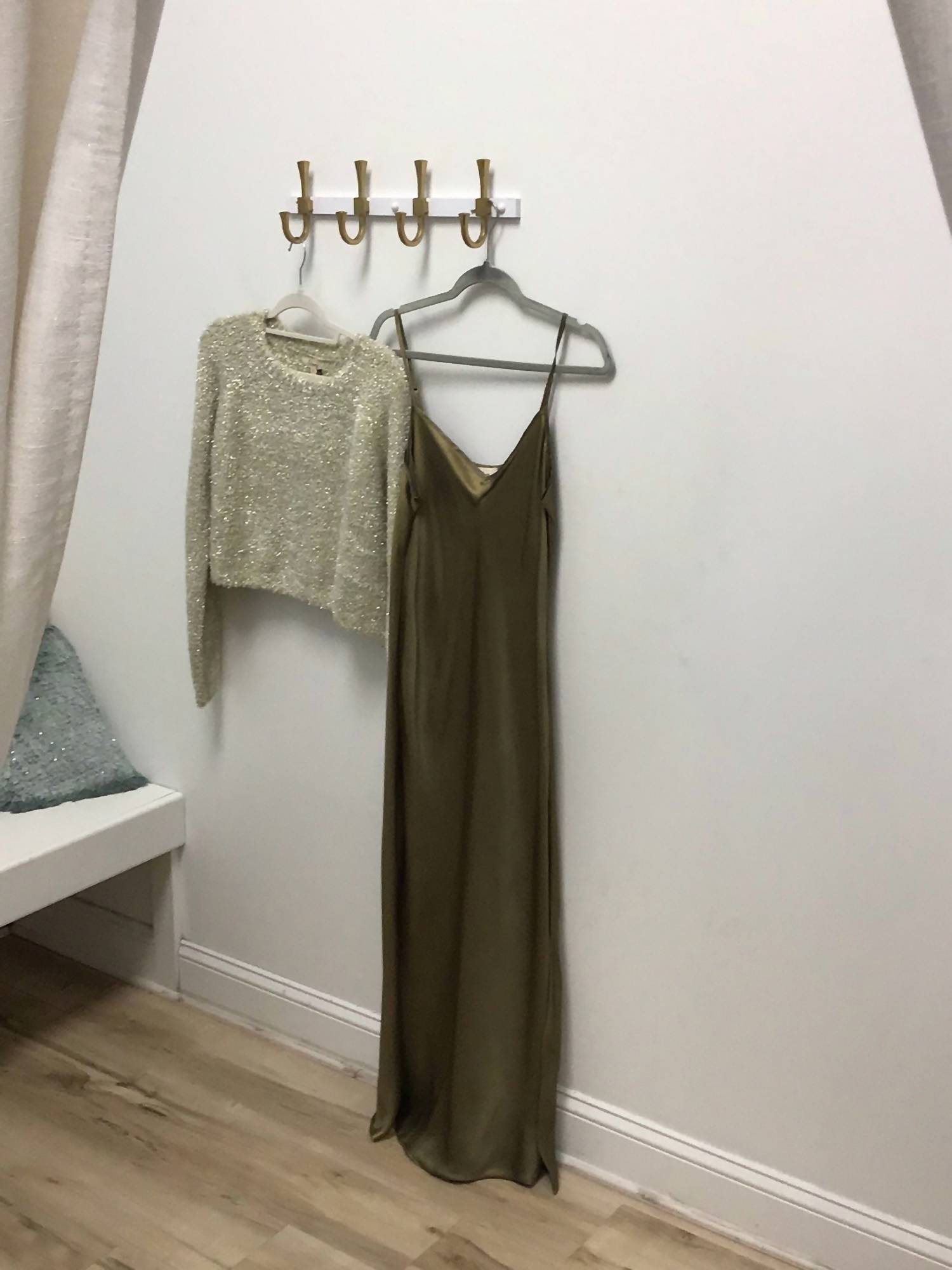 Combine este maxi com seu colar e sandálias favoritos para um look perfeito. Vestido dourado com alças ajustáveis e suéter dourado com cílios por cima