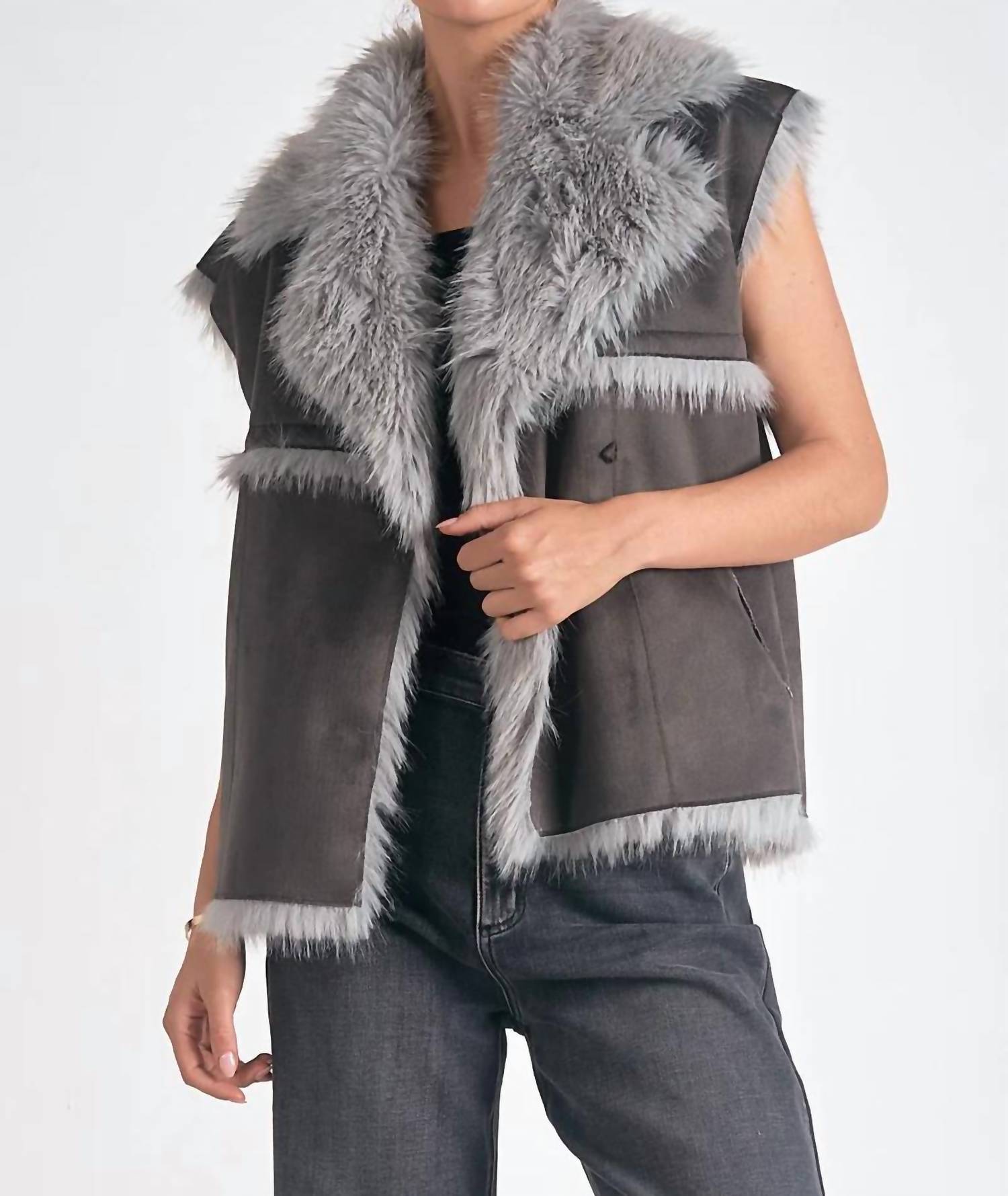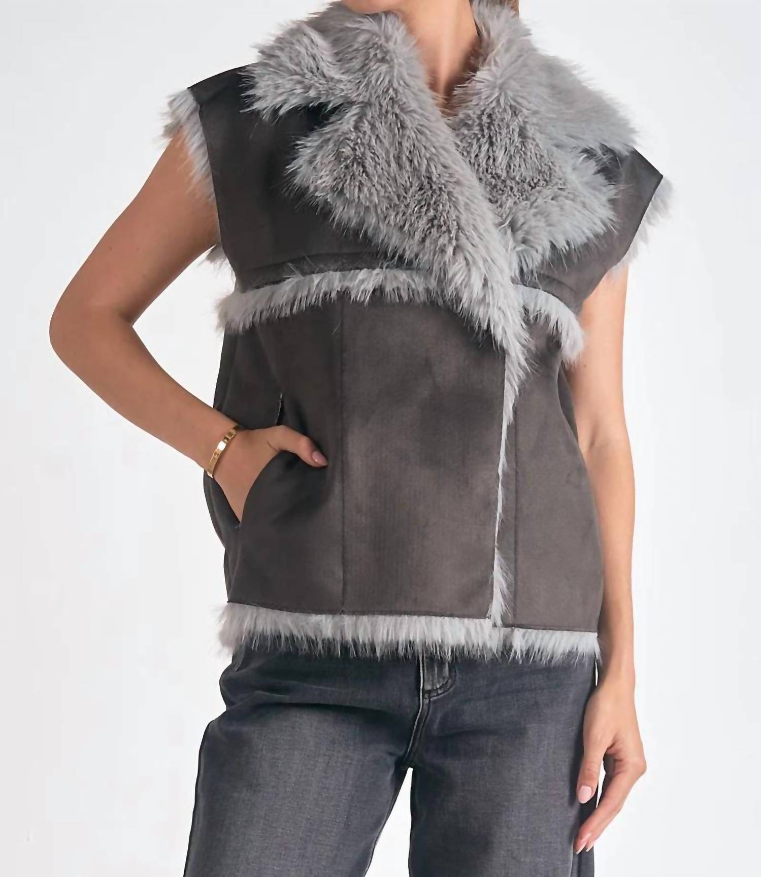 Aquela peça extra que você não sabia que precisava! Peça requintada confeccionada em 100% poliéster para um toque de luxo. Desenhado em um elegante tom carvão. O colete sem mangas apresenta uma gola jumbo dramática com acabamento em camurça. Fechamento por botão. Abrace a elegância sem esforço.