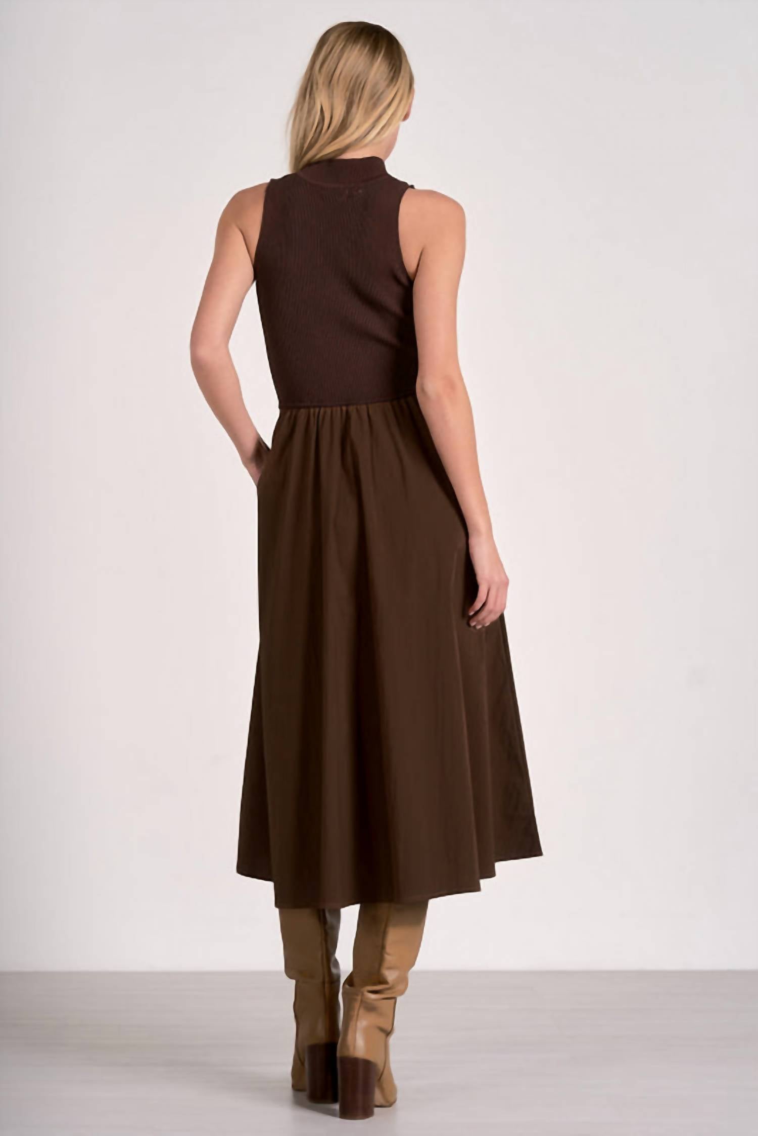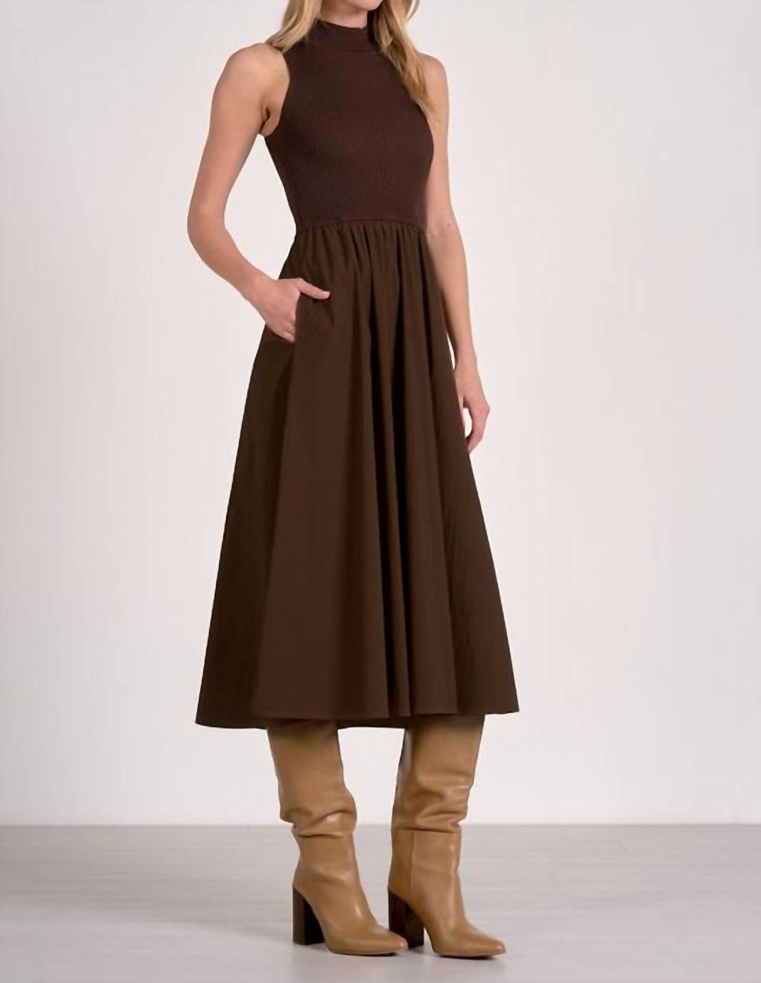 Who doesn't love a good maxi dress? This one you'll be reaching for season after season. Introducing the Elsie Maxi Dress by ELAN, a must-have for this fall in a rich cocoa hue. This sleeveless dress boasts a fitted mock neck bodice, creating a flattering A-line silhouette with a full gathered skirt. Crafted from a blend featuring 65% cotton and 32% polymide, it's designed with a pull-on closure and convenient pockets for functionality. Care for this solid-patterned piece is simple with dry clean only instructions, perfect for a dinner party or a minimalist Thanksgiving look.