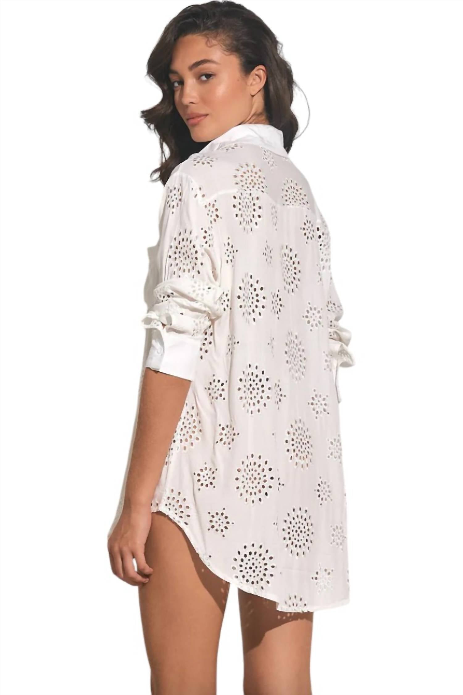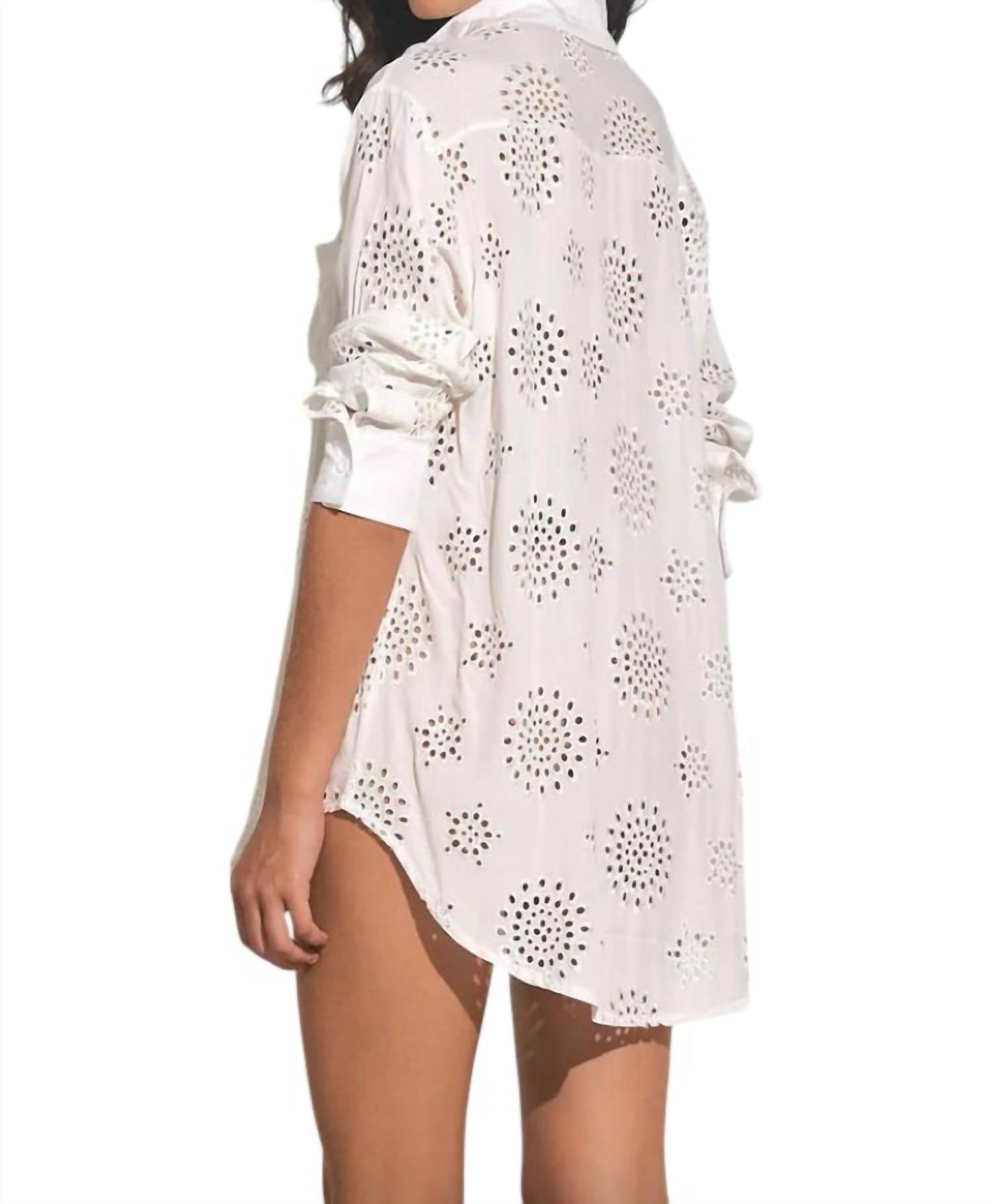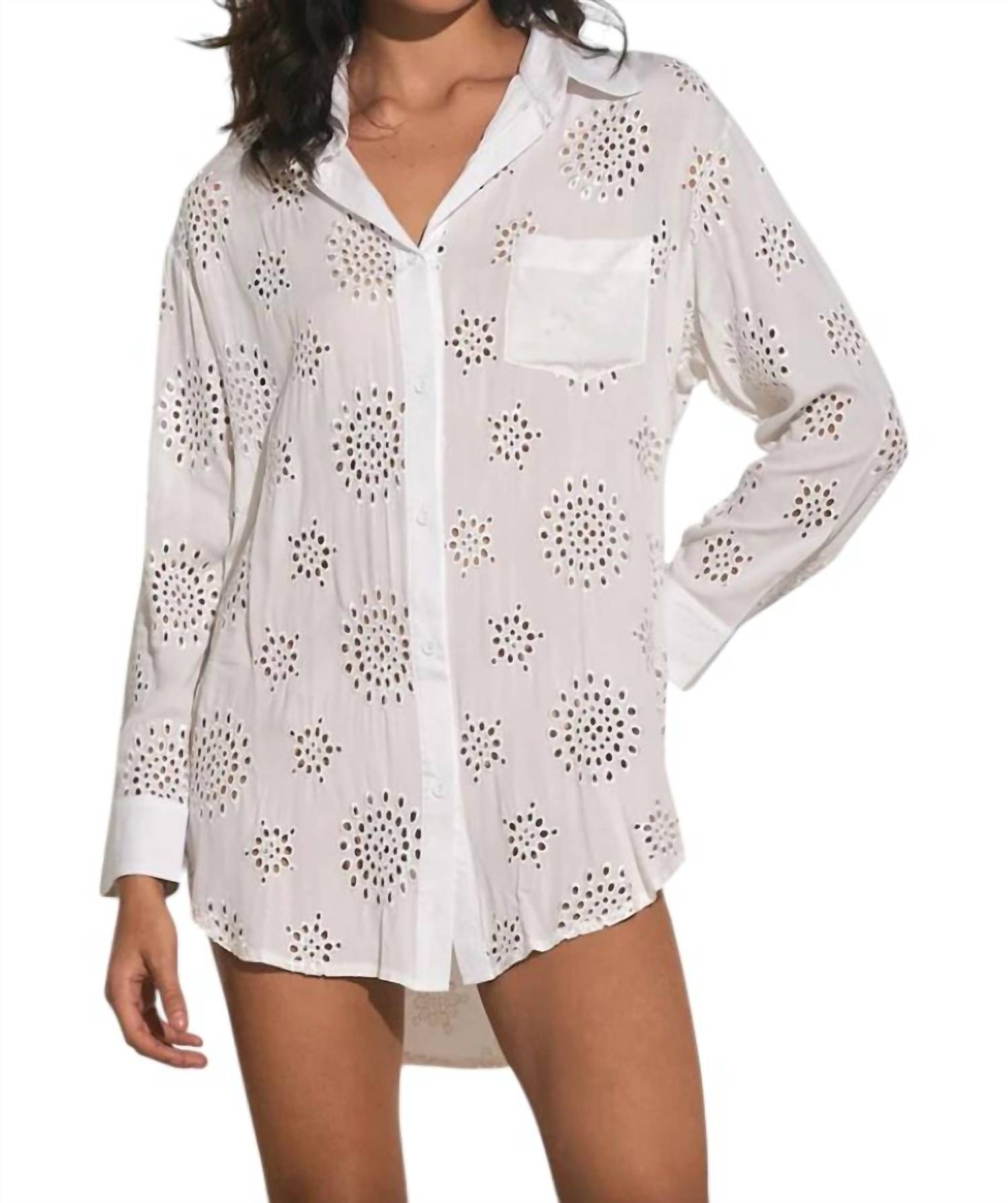 Uma saída de praia confortável para o dia todo que funciona tão bem no jantar quanto na piscina. Combinação perfeita de estilo e conforto em tecido branco com ilhós. Possui mangas longas e modelagem abotoada. Confeccionada em 60% rayon e 40% poliéster. Oferece elegância com seu design estampado e apelo versátil.