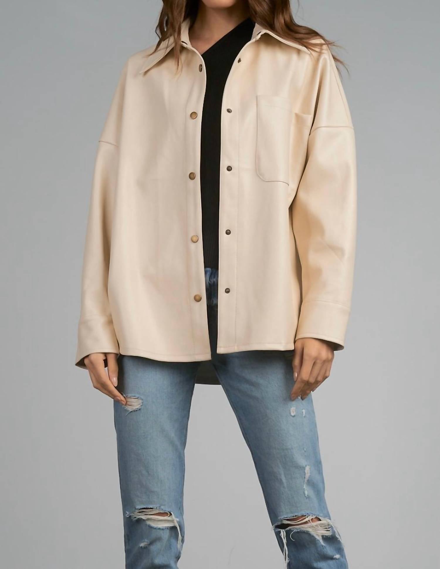 Elegante e elegante. Botões grandes. Grande. Couro sintético. Botões. Visual elegante. Bolso frontal. Gola alta.